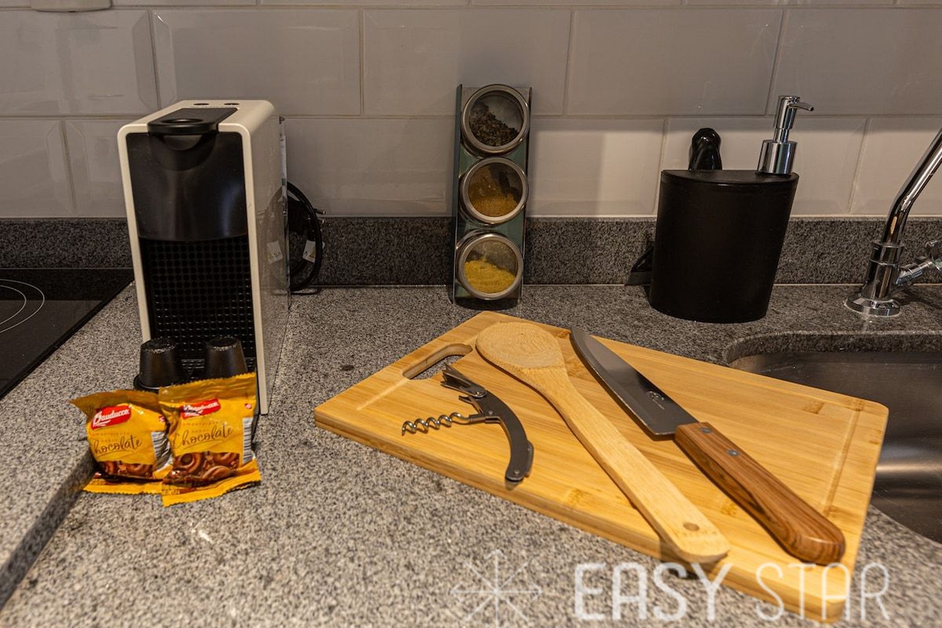 A cozinha é completa e possui todos os utensílios necessários para preparar suas refeições. Ela inclui um cooktop, microondas, geladeira, uma máquina de café Nespresso, panelas, copos, pratos e talheres. Existem dois espaços para refeições, cada um com dois lugares, perfeito para desfrutar de suas refeições com conforto.