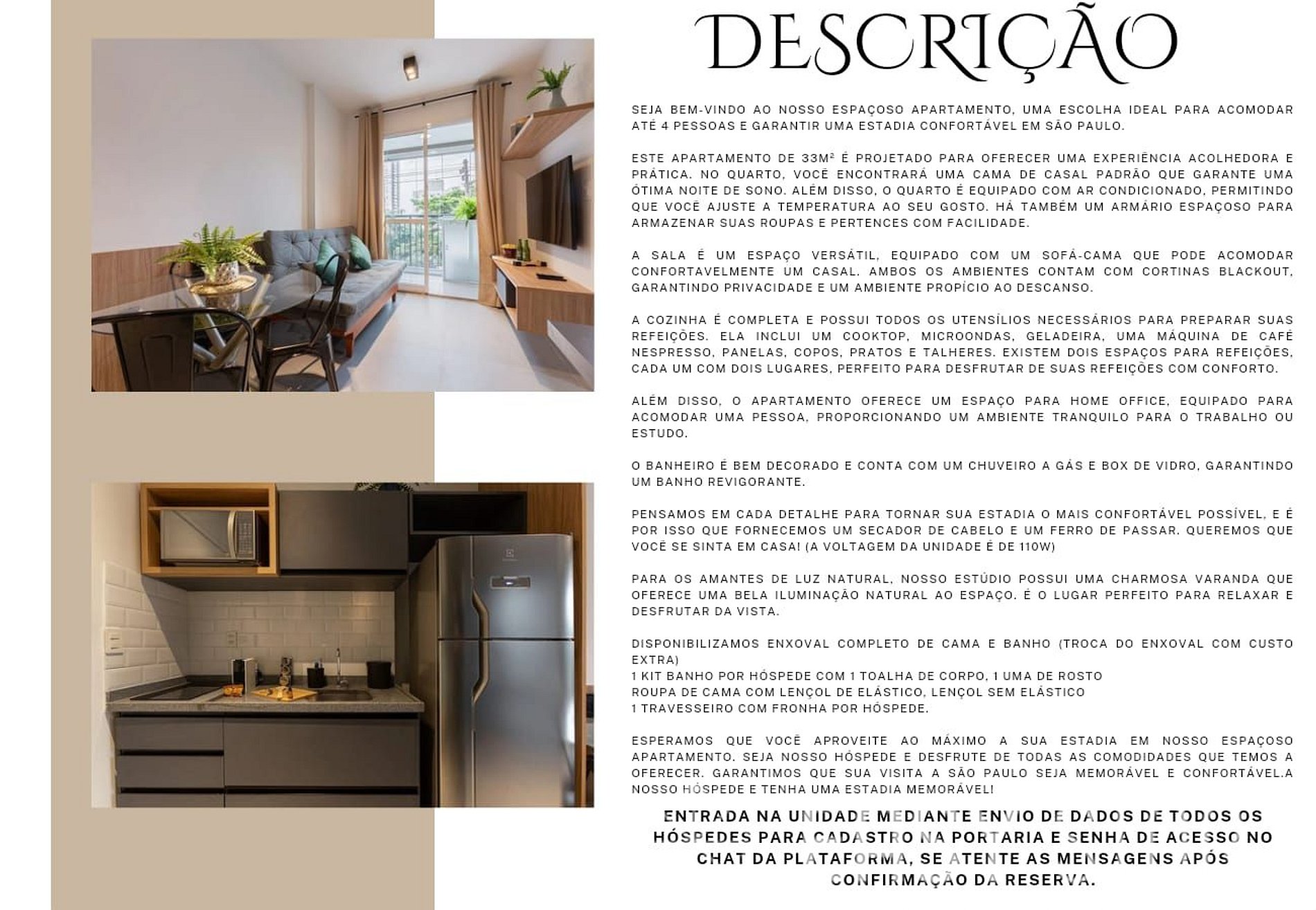 - Essa é uma unidade dentro de um prédio residencial e será como se fosse sua casa por alguns dias. Cuide bem dela, respeite os vizinhos e seja cordial com o porteiro.