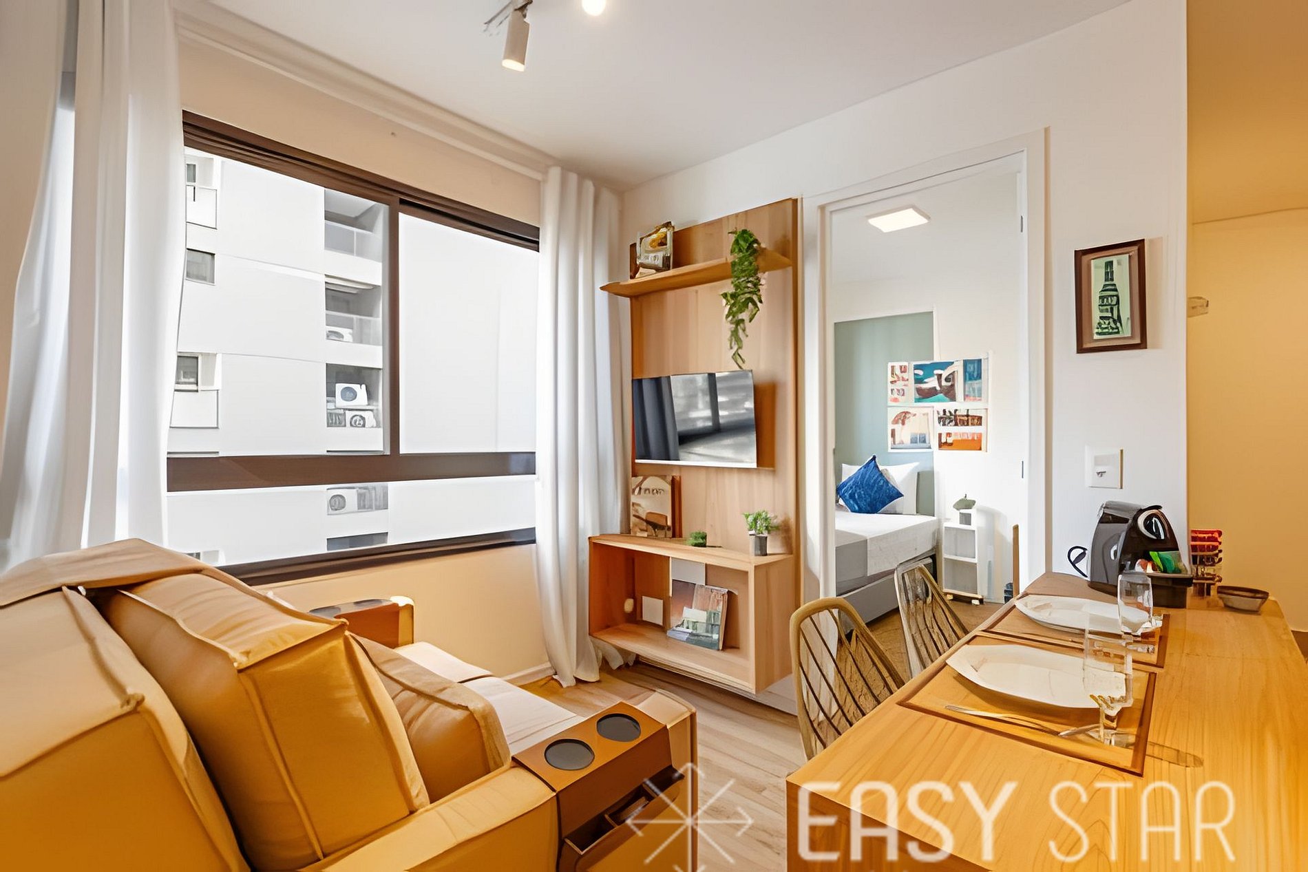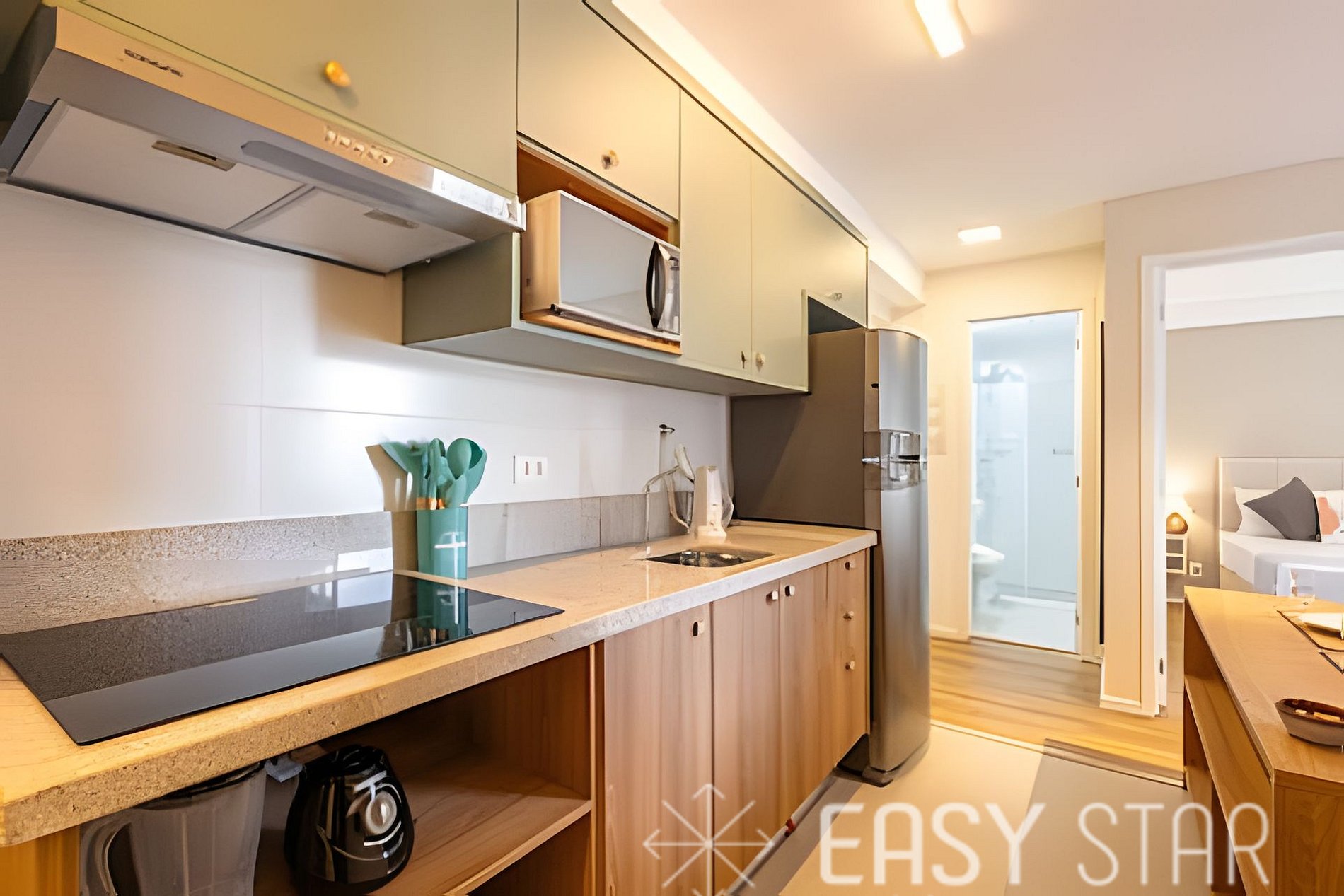 Nossa cozinha compacta e totalmente equipada torna fácil preparar suas refeições favoritas, com uma cafeteira Nespresso, cooktop, forno, geladeira, micro-ondas e todos os utensílios necessários à sua disposição. Além disso, nosso processo de check-in é facilitado com fechadura digital, garantindo sua segurança e conveniência desde o momento da chegada.