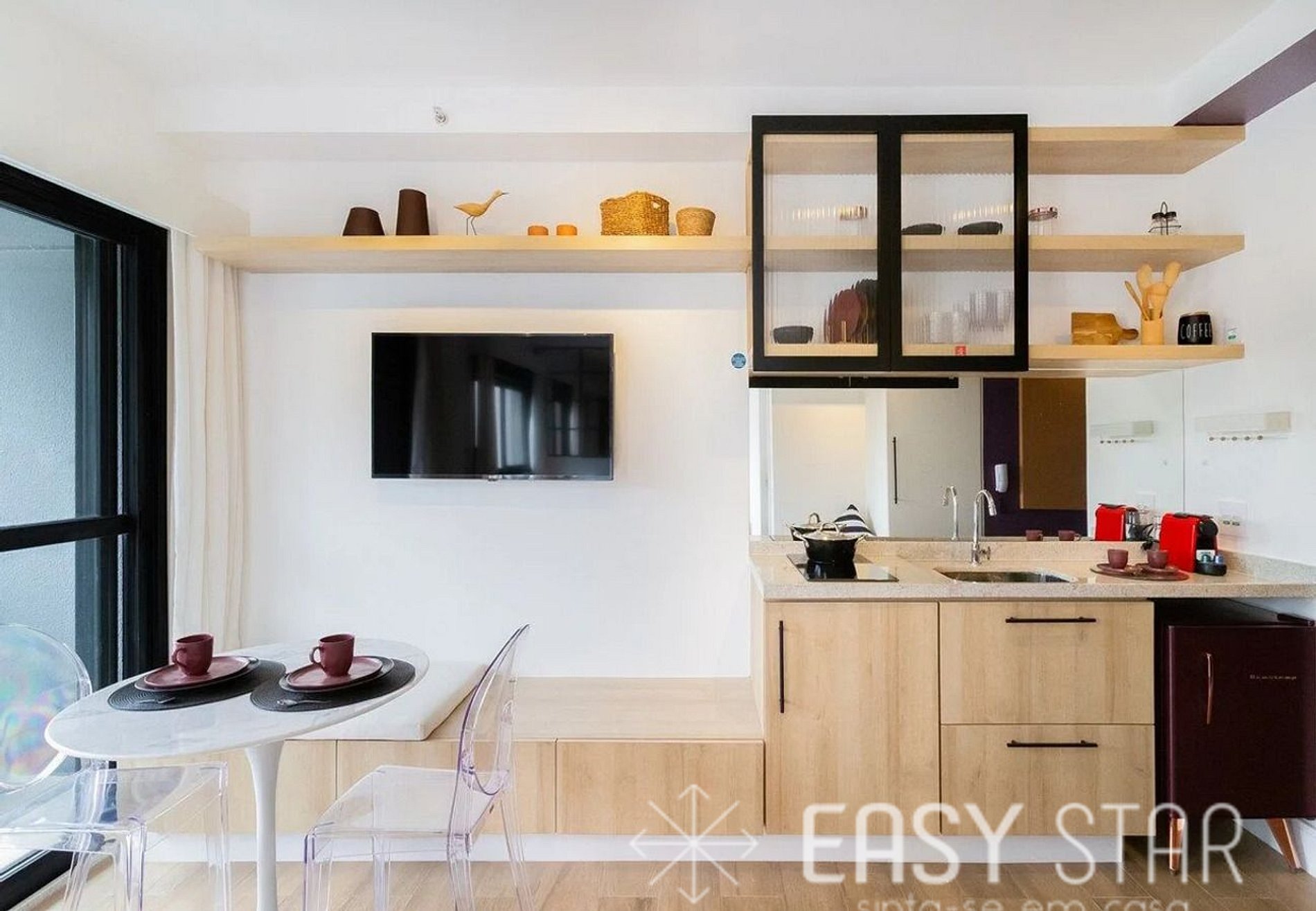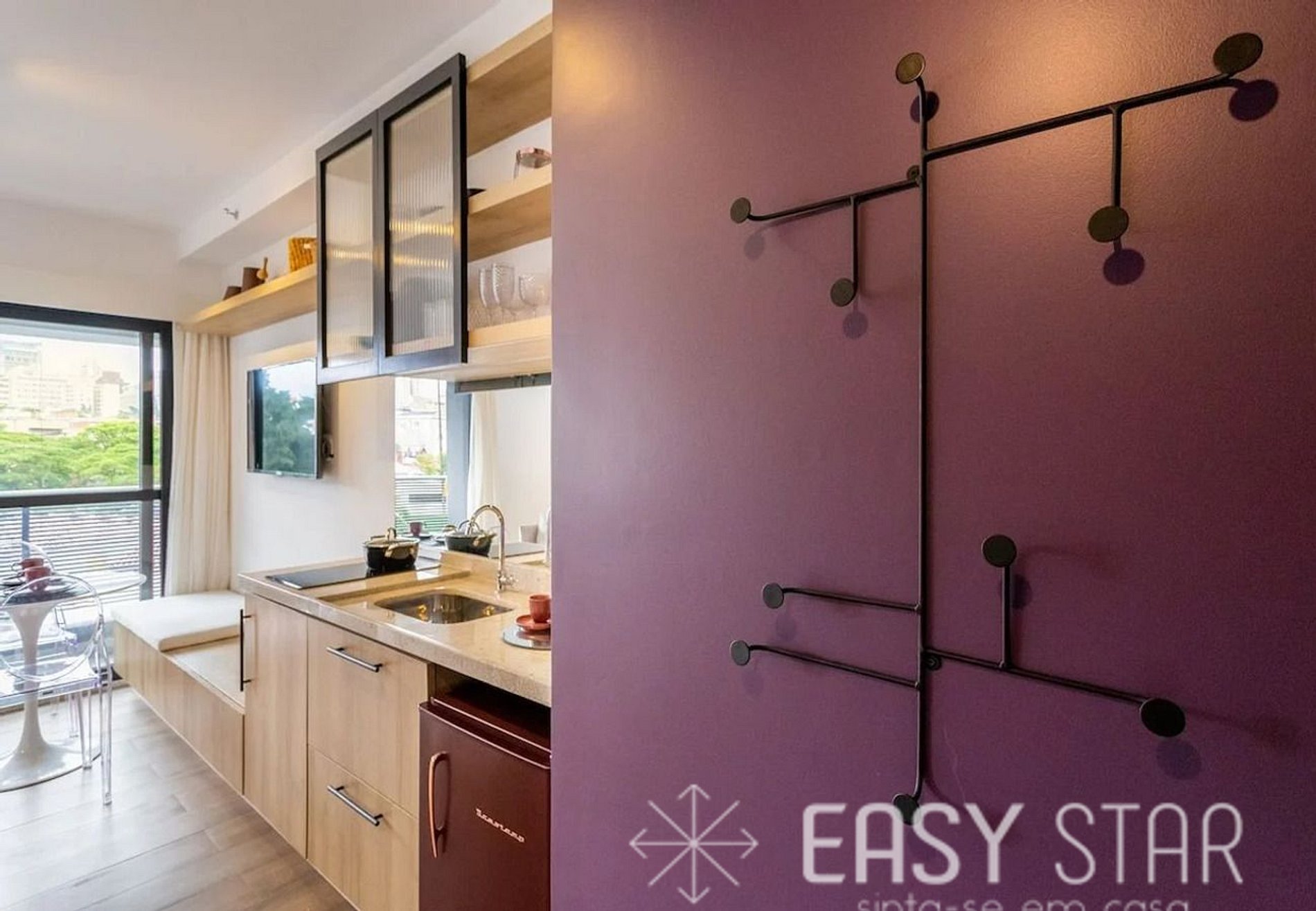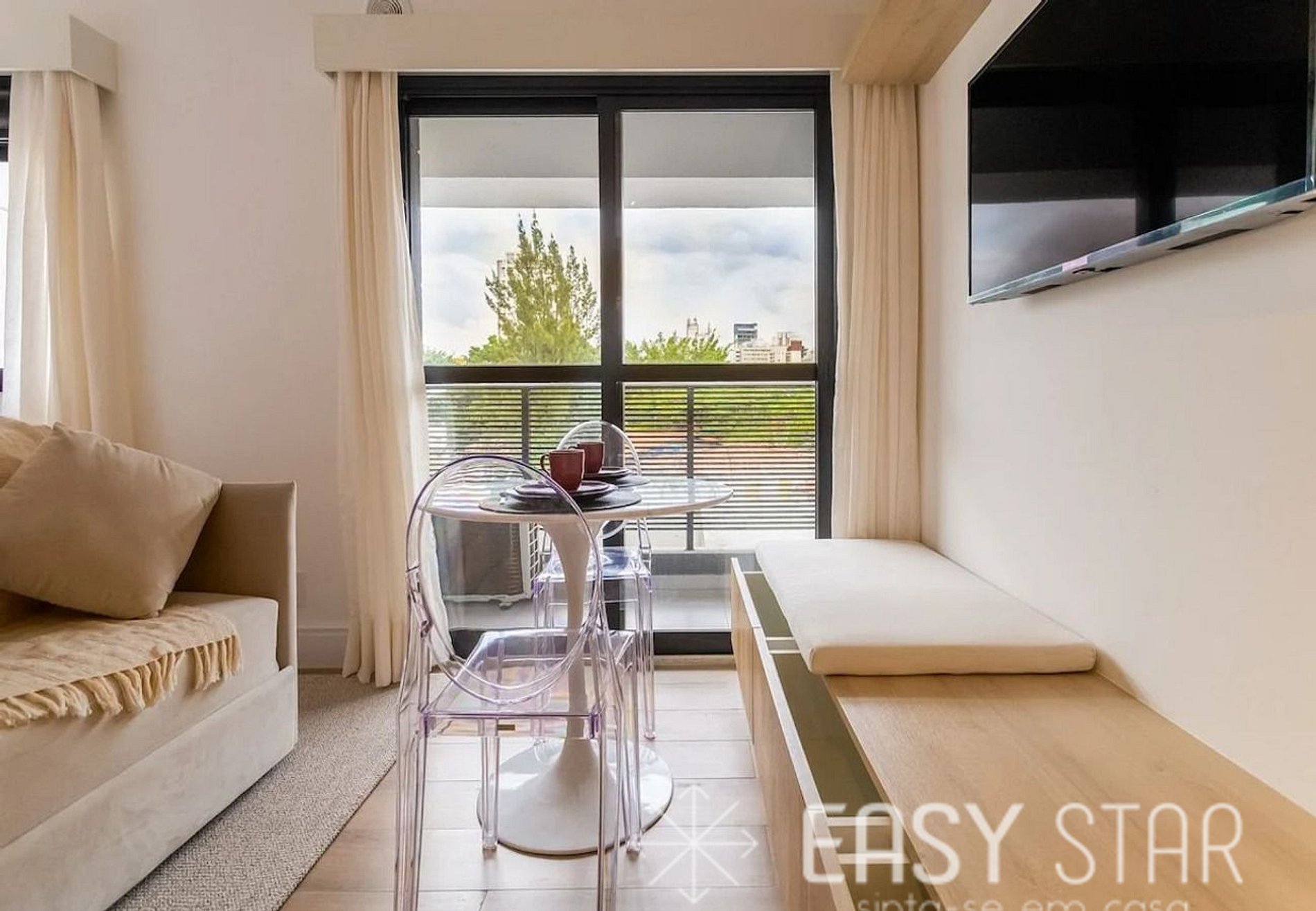 Além disso, o nosso estúdio possui uma adorável varanda que permite a entrada de uma linda iluminação natural, criando um ambiente acolhedor e aconchegante para sua estadia.