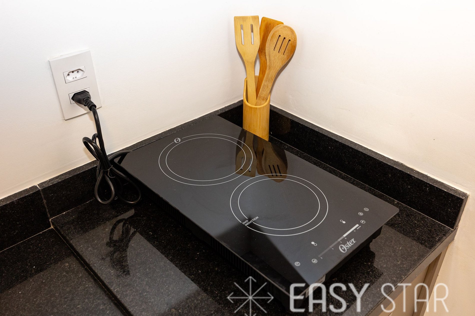 A cozinha está totalmente equipada com um cooktop de indução com 2 bocas, liquidificador, panelas, copos, pratos e talheres, permitindo que você cozinhe suas refeições com facilidade.