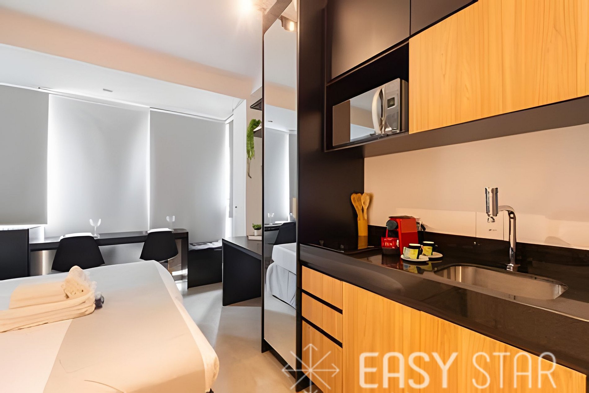 Aqui, acomodamos até duas pessoas em uma cama Queen-size. A cozinha está totalmente equipada com um cooktop elétrico de 2 bocas, liquidificador, panelas, copos, pratos e talheres, permitindo que você cozinhe suas refeições com facilidade. Para os amantes de café, oferecemos uma máquina Nespresso para que você possa desfrutar de suas bebidas favoritas a qualquer momento. Além disso, você encontrará uma geladeira e um micro-ondas e forninho elétrico para suas necessidades culinárias. Para sua conveniência, disponibilizamos um secador de cabelo e um ferro de passar, garantindo que você esteja sempre impecável durante sua estadia. Por favor, note que a voltagem da unidade é de 110W, então você não precisa se preocupar com adaptadores. Disponibilizamos enxoval completo de cama e banho (troca do enxoval com custo extra) 1 kit banho por hóspede com 1 toalha de corpo, 1 uma de rosto Roupa de cama com lençol de elástico, lençol sem elástico 1 travesseiro com fronha por hóspede. 1 manta microfibra por cama. Além disso, o nosso estúdio possui uma adorável varanda que permite a entrada de uma linda iluminação natural, criando um ambiente acolhedor e aconchegante para sua estadia. Esperamos que você aproveite sua estadia conosco e se sinta em casa em nosso estúdio bem-equipado. Seja bem-vindo e desfrute de todos os confortos que preparamos para tornar sua experiência memorável.
