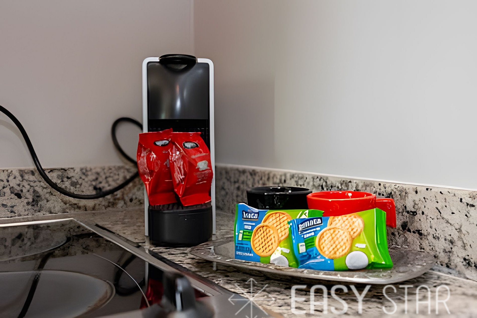 Encontrará una cocina compacta y completamente equipada con todos los utensilios necesarios para hacer su estancia cómoda y agradable. Incluye microondas, minibar, cocina de dos hornallas, ollas y una cafetera eléctrica, lo que le permite preparar comidas o refrigerios en cualquier momento.