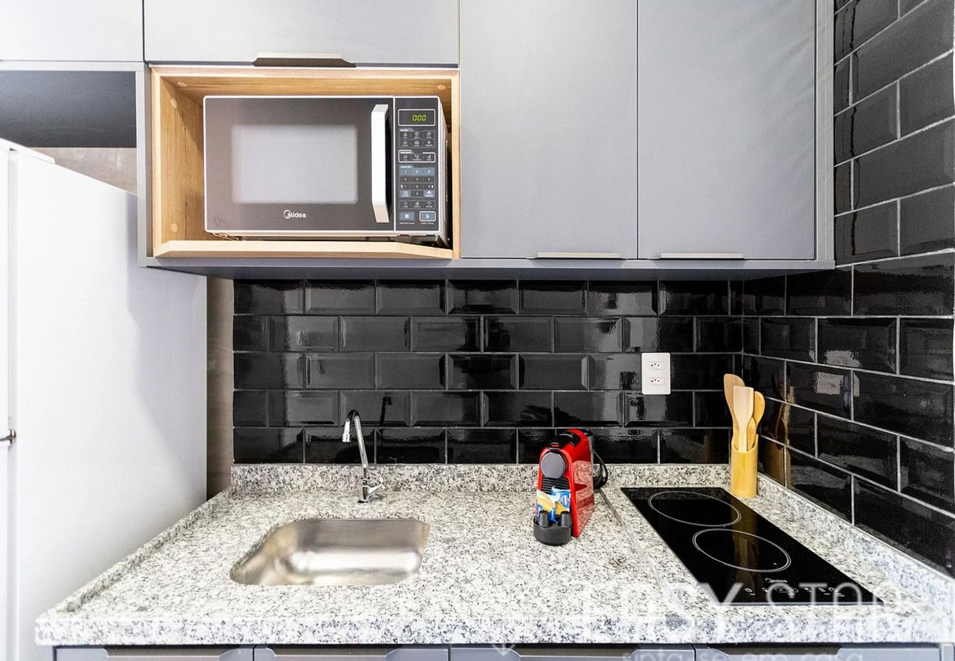 A cozinha compacta e completa é perfeita para preparar suas refeições com facilidade. Ela possui um fogão de indução de 2 bocas, ideal para cozinhar suas receitas favoritas, bem como um micro-ondas e uma geladeira espaçosa para armazenar seus alimentos e bebidas. Você encontrará todos os utensílios domésticos necessários, permitindo que você cozinhe com facilidade e estilo.
