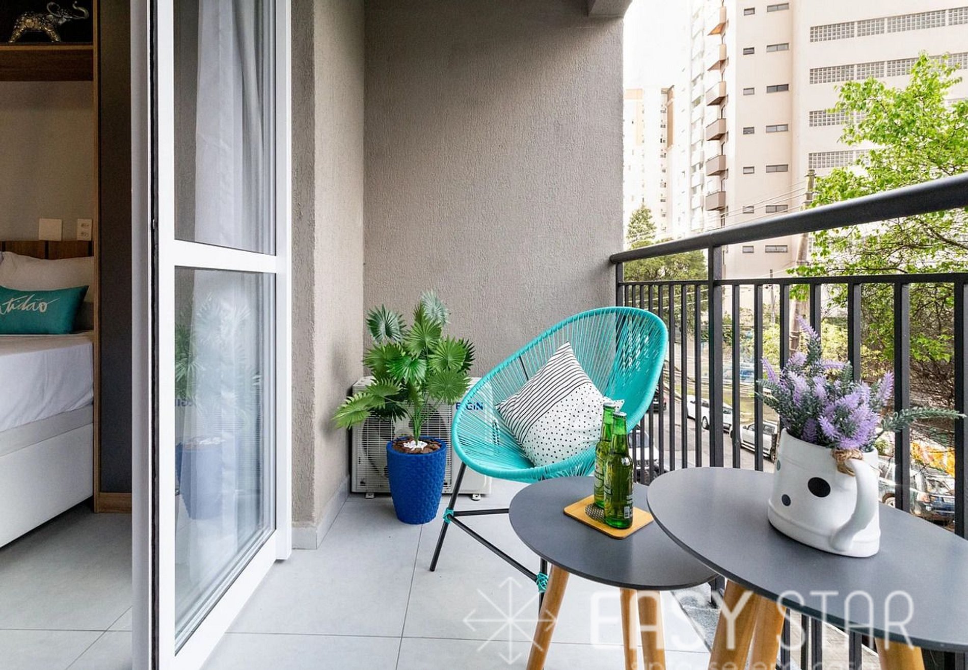 Para os amantes de luz natural, nosso estúdio possui uma charmosa varanda que oferece uma bela iluminação natural ao espaço. É o lugar perfeito para relaxar e desfrutar da vista.