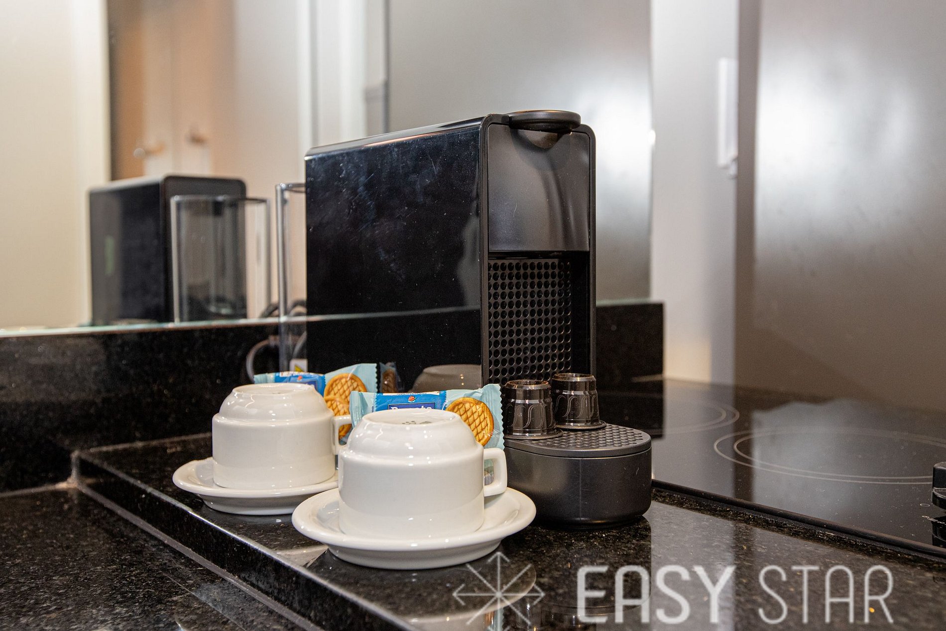 Cozinha completa e compacta conta com micro-ondas, geladeira duas portas, cooktop indução de 2 bocas, máquina Nespresso e demais utensilios para o preparo das suas refeições.