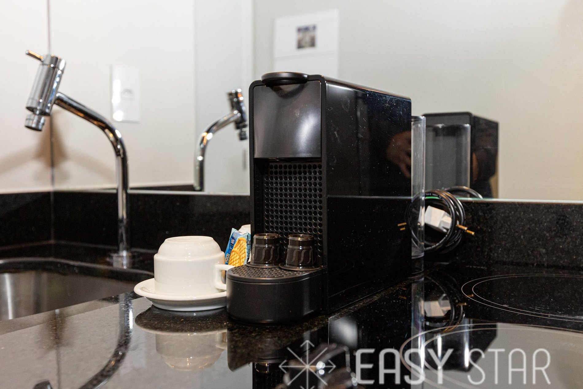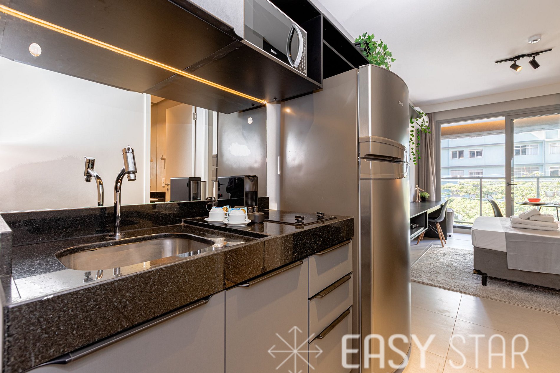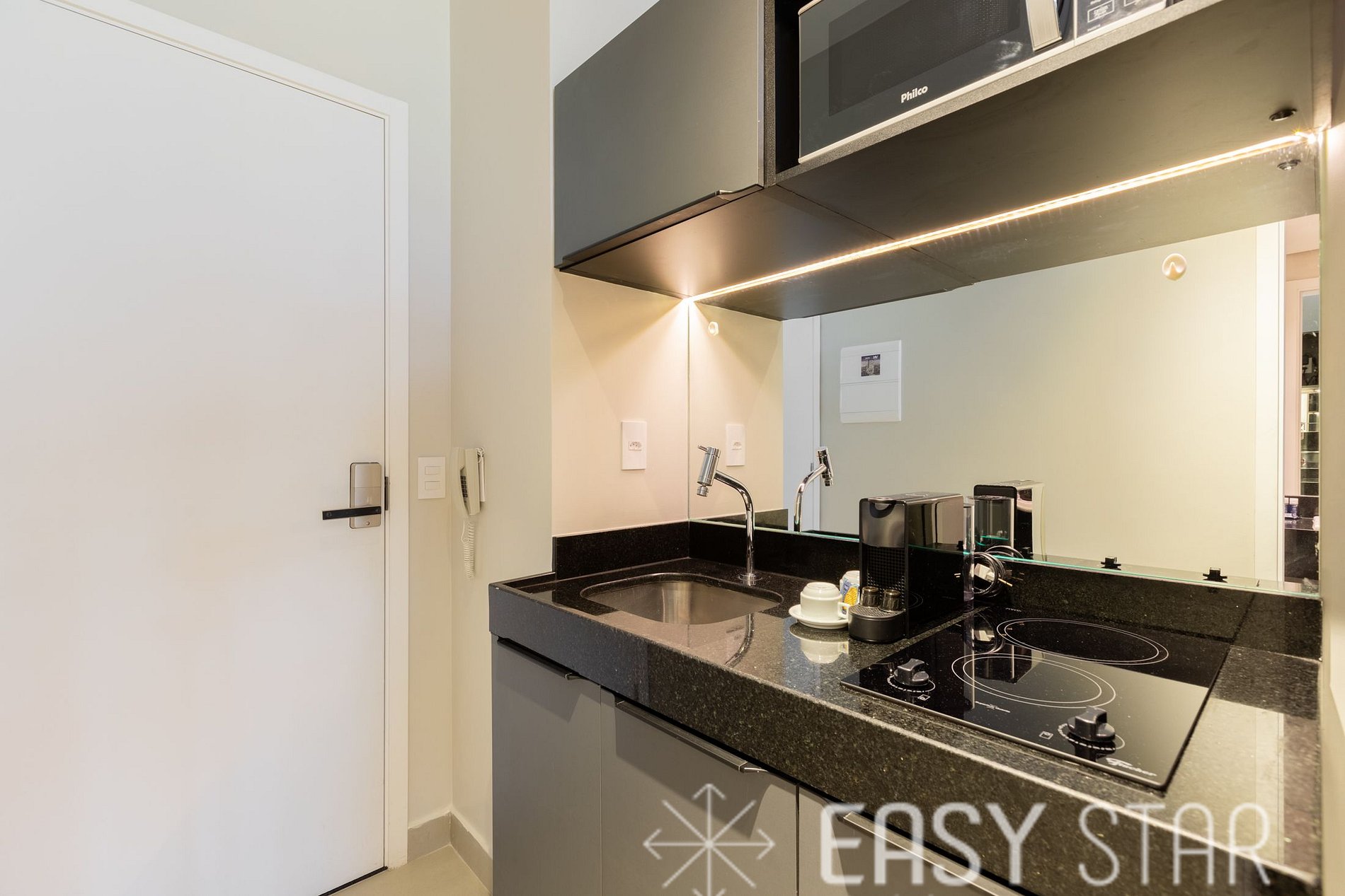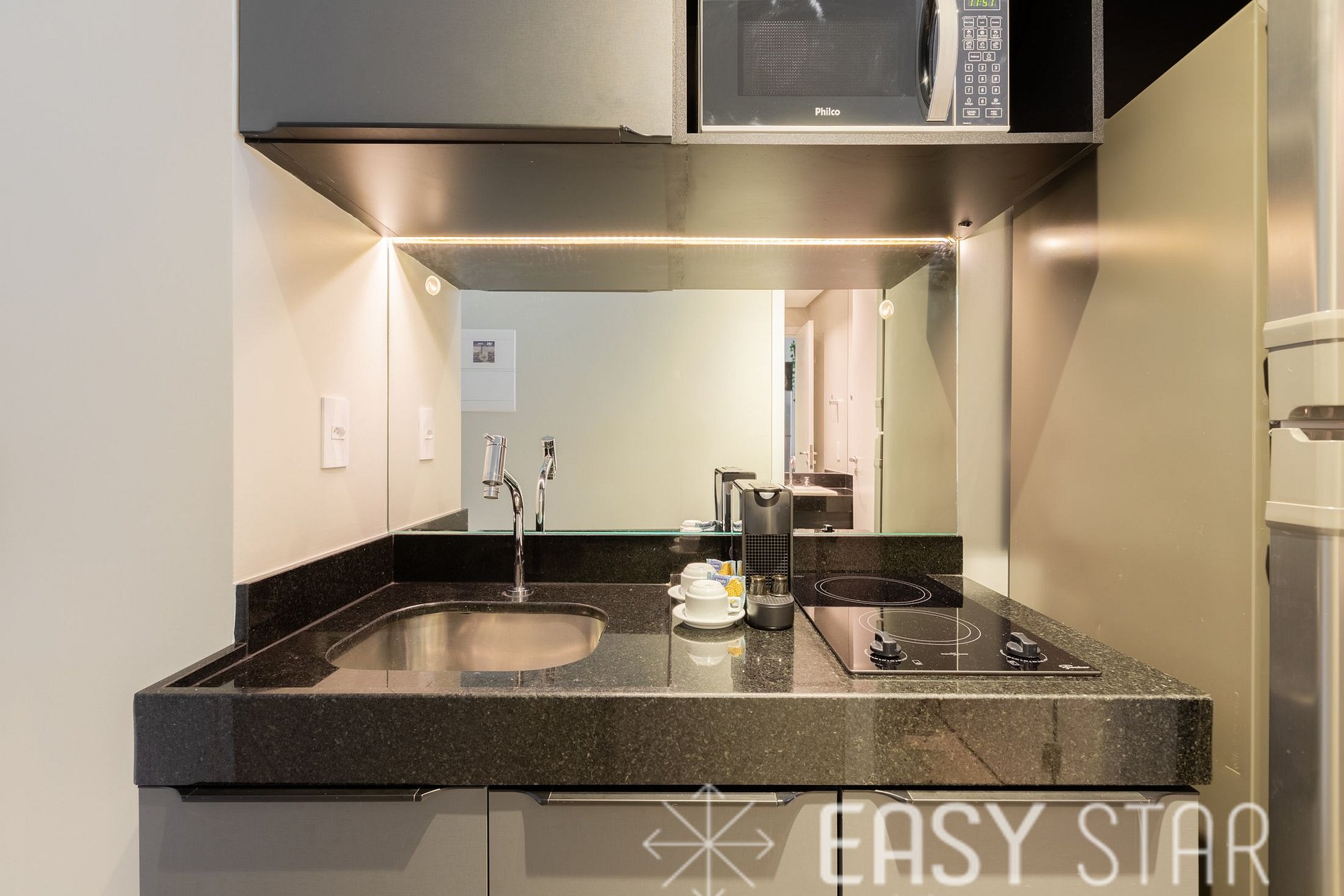 Cozinha completa e compacta conta com micro-ondas, geladeira duas portas, cooktop indução de 2 bocas, máquina Nespresso e demais utensilios para o preparo das suas refeições.