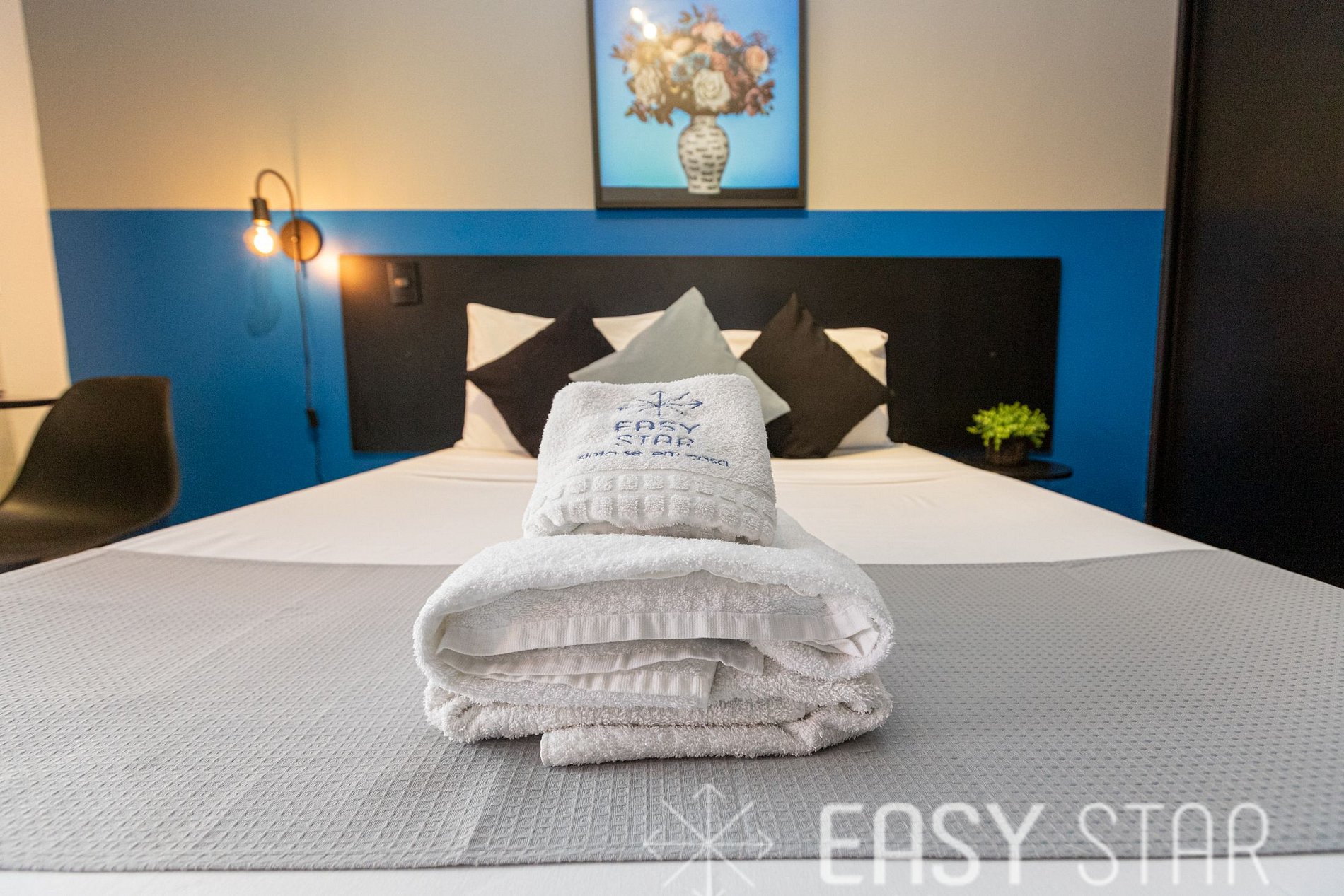 Oferecemos enxoval de cama e banho e 1 manta microfibra por cama.