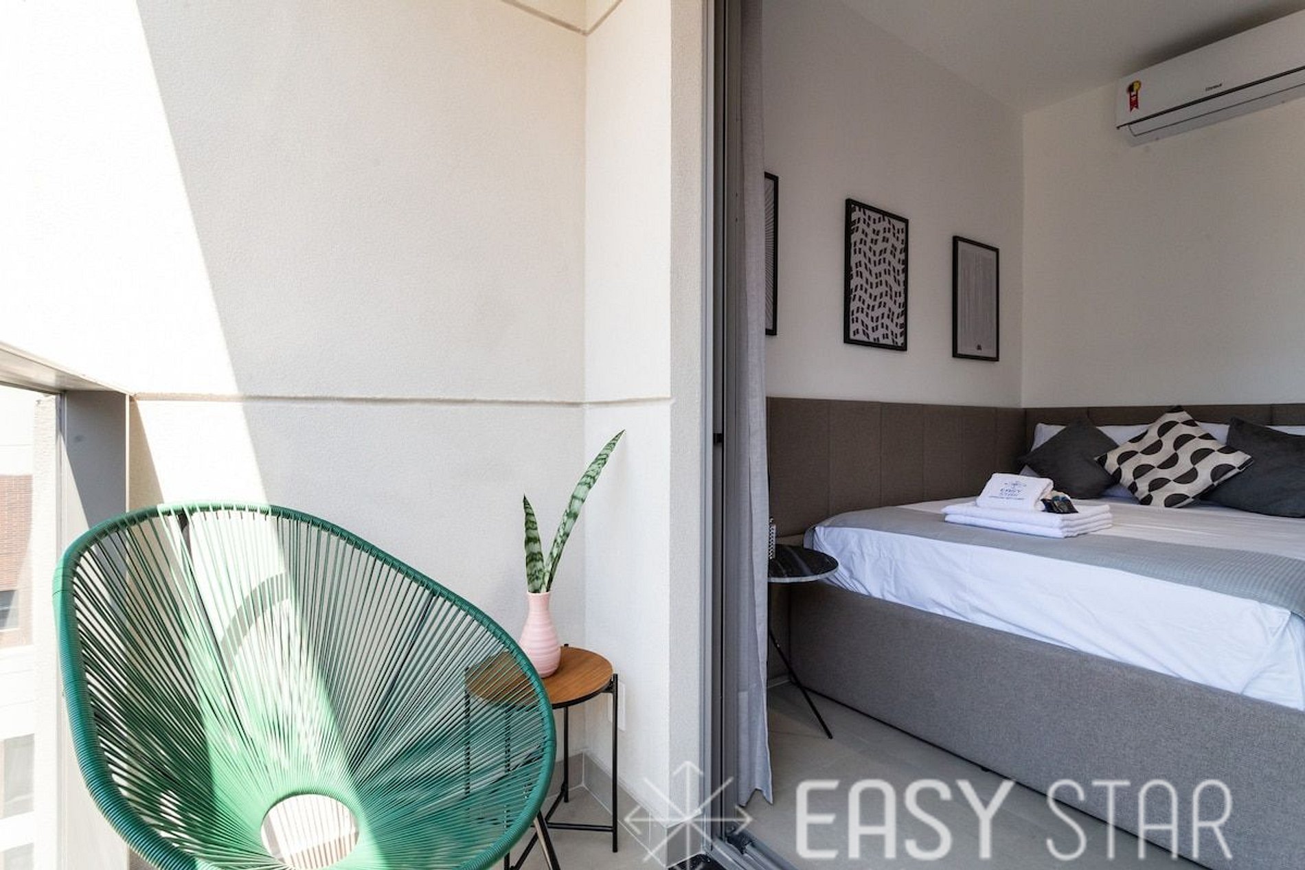 Uma característica especial deste estúdio é a ampla varanda, que oferece uma vista deslumbrante da cidade e traz uma bela iluminação natural para o quarto. É o local perfeito para relaxar e apreciar a paisagem urbana.