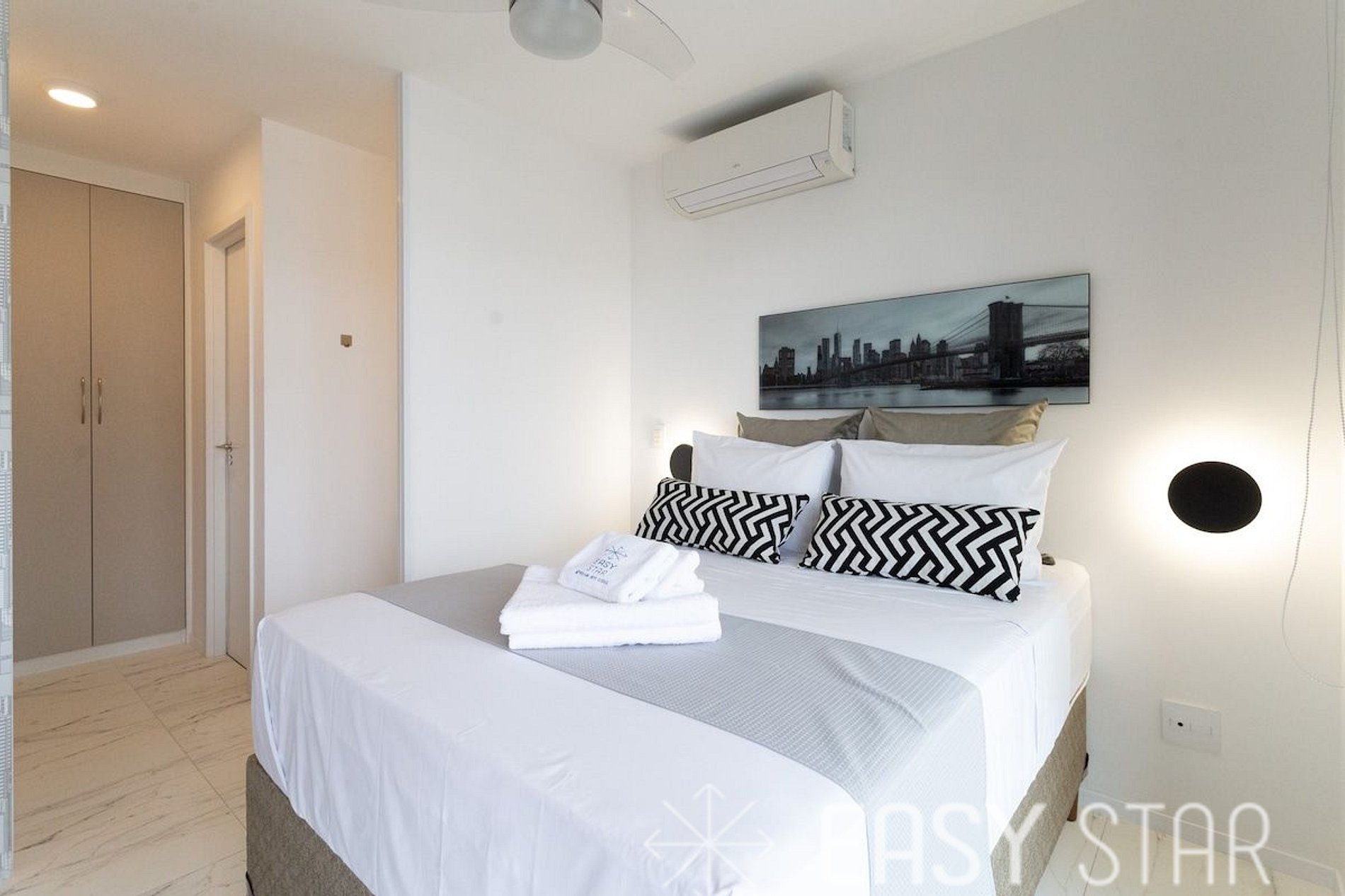 Aqui, você encontrará uma cama de casal com um colchão novo de tamanho padrão, ideal para acomodar até duas pessoas. O quarto também dispõe de um amplo guarda-roupa e uma TV que gira, permitindo que você assista confortavelmente tanto da cama quanto do sofá.