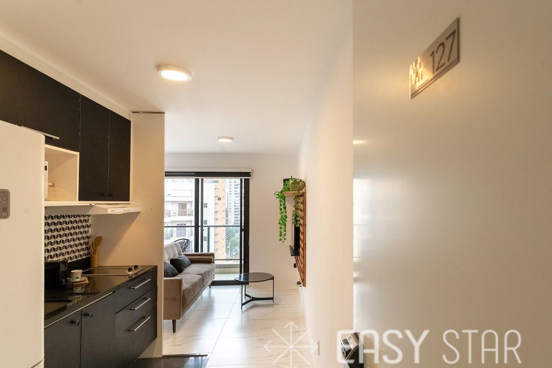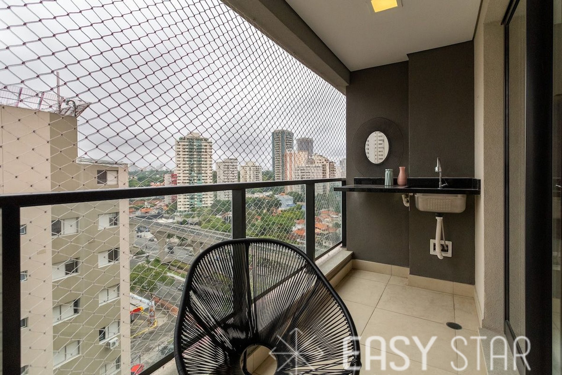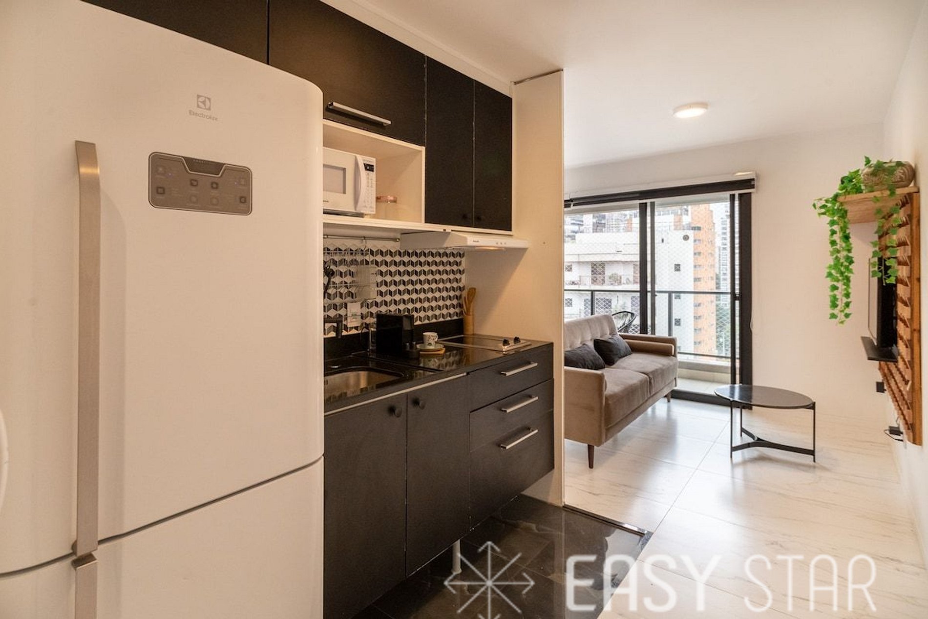Além disso, o studio possui uma encantadora varanda com vista para o bairro, que oferece uma abundância de luz natural, criando um ambiente alegre e acolhedor.