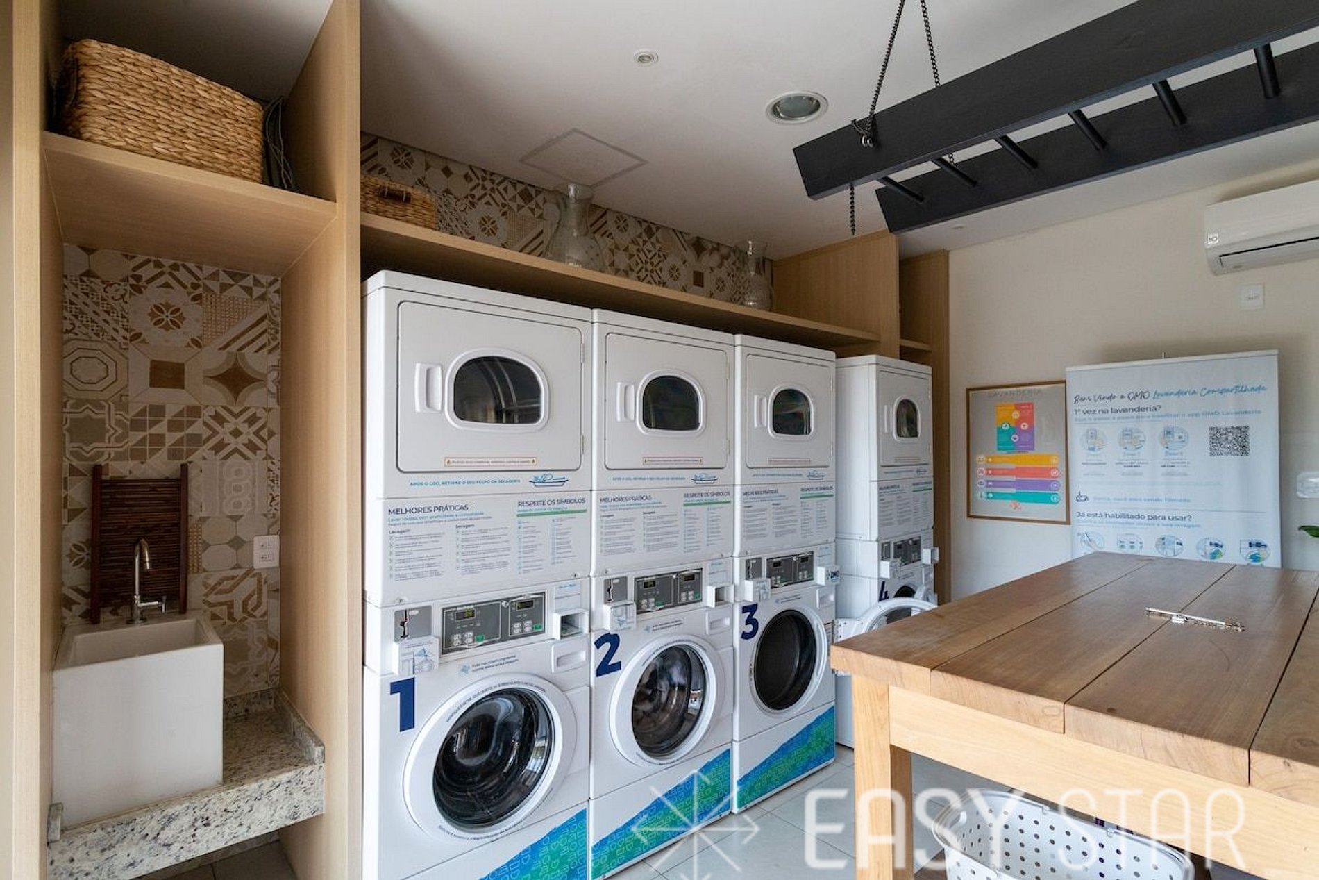 Oferecemos uma lavanderia coletiva, com produtos OMO de qualidade, disponível mediante pagamento à parte, garantindo que suas roupas estejam sempre impecáveis.