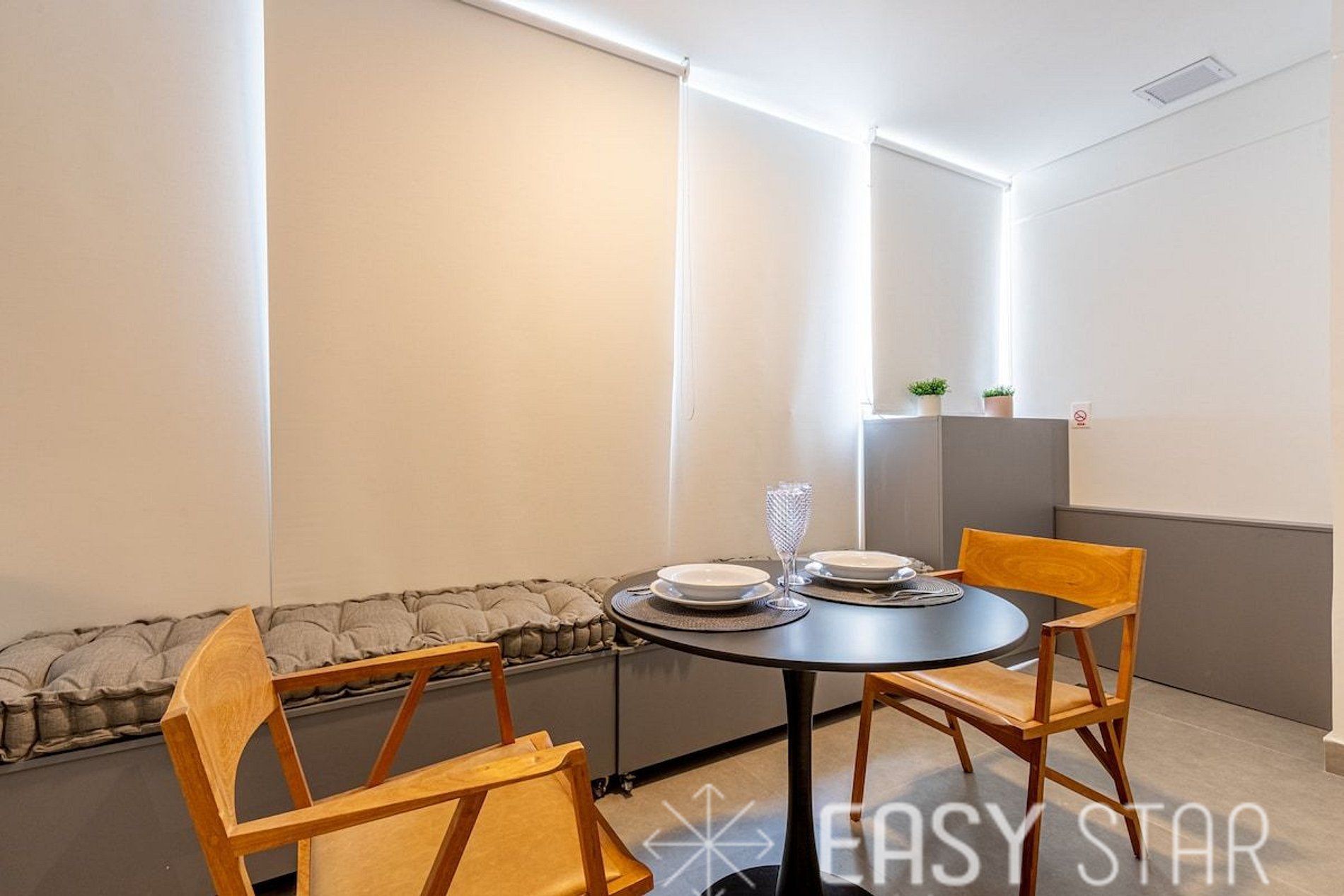 Tenha à sua disposição duas encantadoras opções para suas refeições: desfrute da varanda ao ar livre, que acomoda confortavelmente dois, ou opte pelo balcão estilo americano na cozinha, onde mais dois convidados podem se acomodar com facilidade. Oferecemos a flexibilidade ideal para que você possa apreciar suas refeições da maneira que mais lhe agradar.