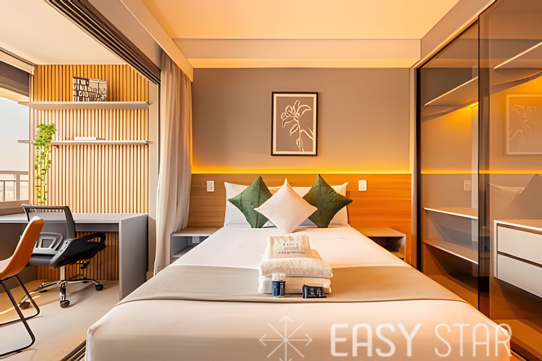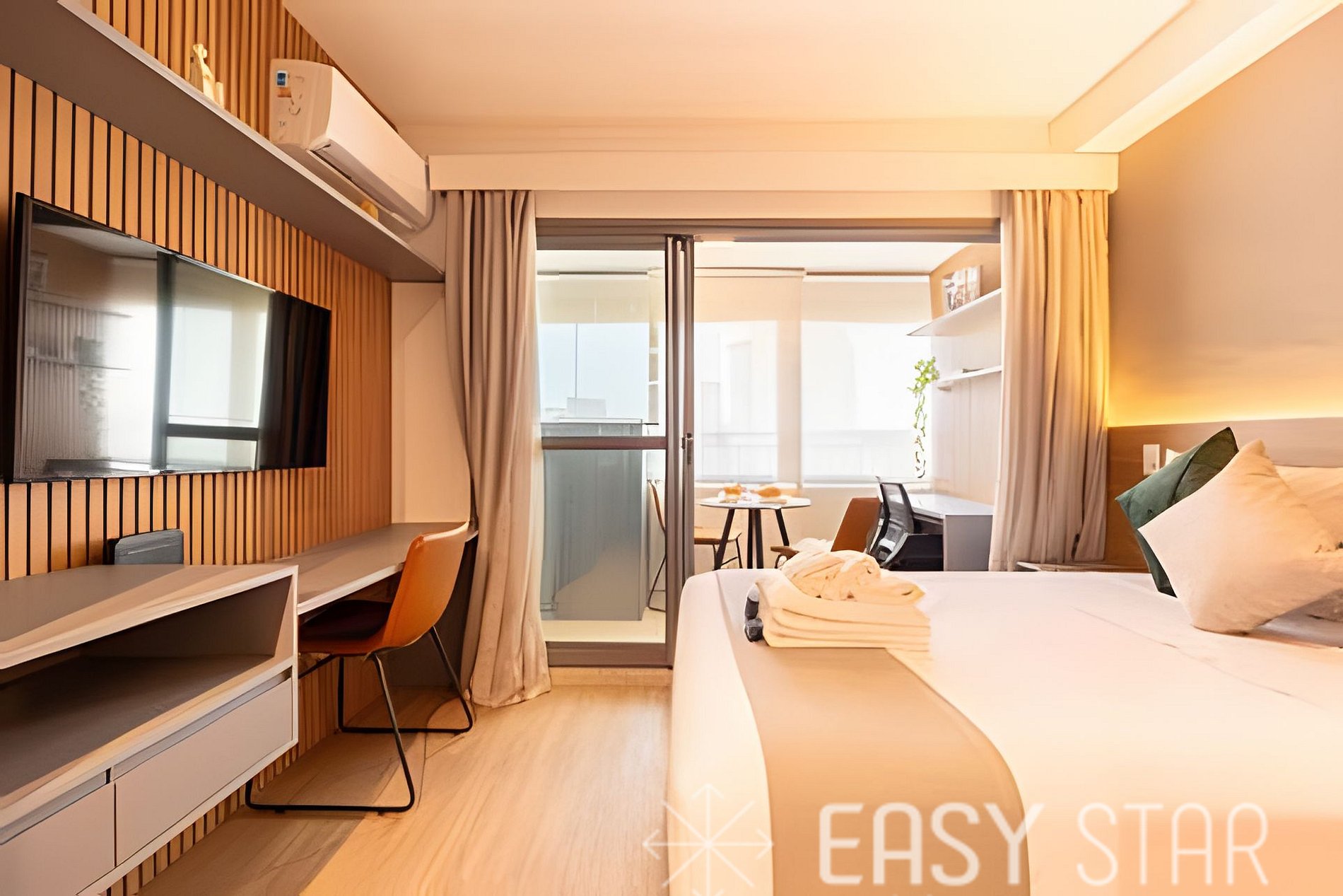 Este espaço é ideal para até 2 pessoas. Oferecemos uma cama casal de tamanho padrão. Além disso, o ar-condicionado split mantém a temperatura ideal, e a TV e o Wi-Fi estão disponíveis para o seu entretenimento e conveniência. Equipada com um cooktop de indução, forninho, máquina Nespresso, micro-ondas, geladeira. (sem alimentos para consumo ou compra) e todos os utensílios necessários, você terá a liberdade de preparar suas refeições favoritas ou experimentar novas receitas. Para sua conveniência, disponibilizamos um secador de cabelo e um ferro de passar, garantindo que você esteja sempre impecável durante sua estadia. Por favor, note que a voltagem da unidade é de 110W, então você não precisa se preocupar com adaptadores. Disponibilizamos enxoval completo de cama e banho (troca do enxoval com custo extra) 1 kit banho por hóspede com 1 toalha de corpo, 1 uma de rosto Roupa de cama com lençol de elástico, lençol sem elástico 1 travesseiro com fronha por hóspede. 1 manta microfibra por cama. Além disso, o nosso estúdio possui uma adorável varanda que permite a entrada de uma linda iluminação natural, criando um ambiente acolhedor e aconchegante para sua estadia. Desfrute de uma estadia única e confortável no nosso estúdio, onde o conforto e a conveniência se unem para tornar sua experiência memorável. Reserve agora e permita-nos ser o seu lar longe de casa!