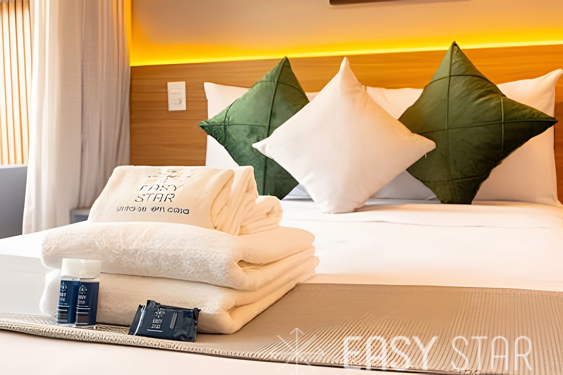 • Kit de banho por hóspede: 1 toalha de corpo e 1 de rosto.