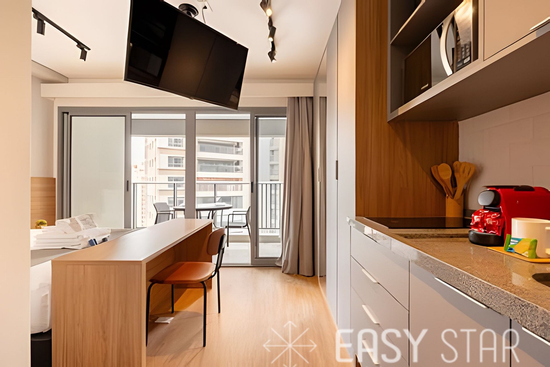 Este espaço é ideal para até 2 pessoas. Oferecemos uma cama casal de tamanho padrão. Além disso, o ar-condicionado split mantém a temperatura ideal, e a TV e o Wi-Fi estão disponíveis para o seu entretenimento e conveniência. Equipada com um cooktop de indução, forninho, máquina Nespresso, micro-ondas, frigobar (sem alimentos para consumo ou compra) e todos os utensílios necessários, você terá a liberdade de preparar suas refeições favoritas ou experimentar novas receitas. Para sua conveniência, disponibilizamos um secador de cabelo e um ferro de passar, garantindo que você esteja sempre impecável durante sua estadia. Por favor, note que a voltagem da unidade é de 110W, então você não precisa se preocupar com adaptadores. Disponibilizamos enxoval completo de cama e banho (troca do enxoval com custo extra) 1 kit banho por hóspede com 1 toalha de corpo, 1 uma de rosto Roupa de cama com lençol de elástico, lençol sem elástico 1 travesseiro com fronha por hóspede. 1 manta microfibra por cama. Além disso, o nosso estúdio possui uma adorável varanda que permite a entrada de uma linda iluminação natural, criando um ambiente acolhedor e aconchegante para sua estadia. Desfrute de uma estadia única e confortável no nosso estúdio, onde o conforto e a conveniência se unem para tornar sua experiência memorável. Reserve agora e permita-nos ser o seu lar longe de casa!