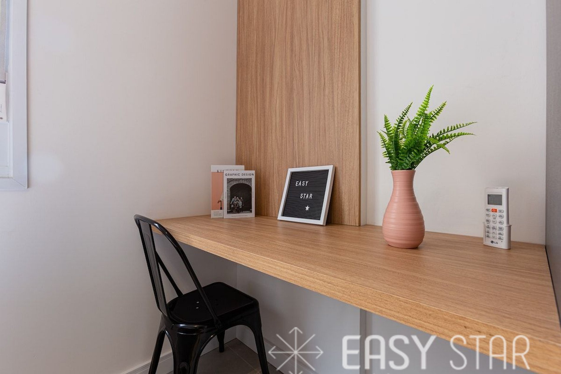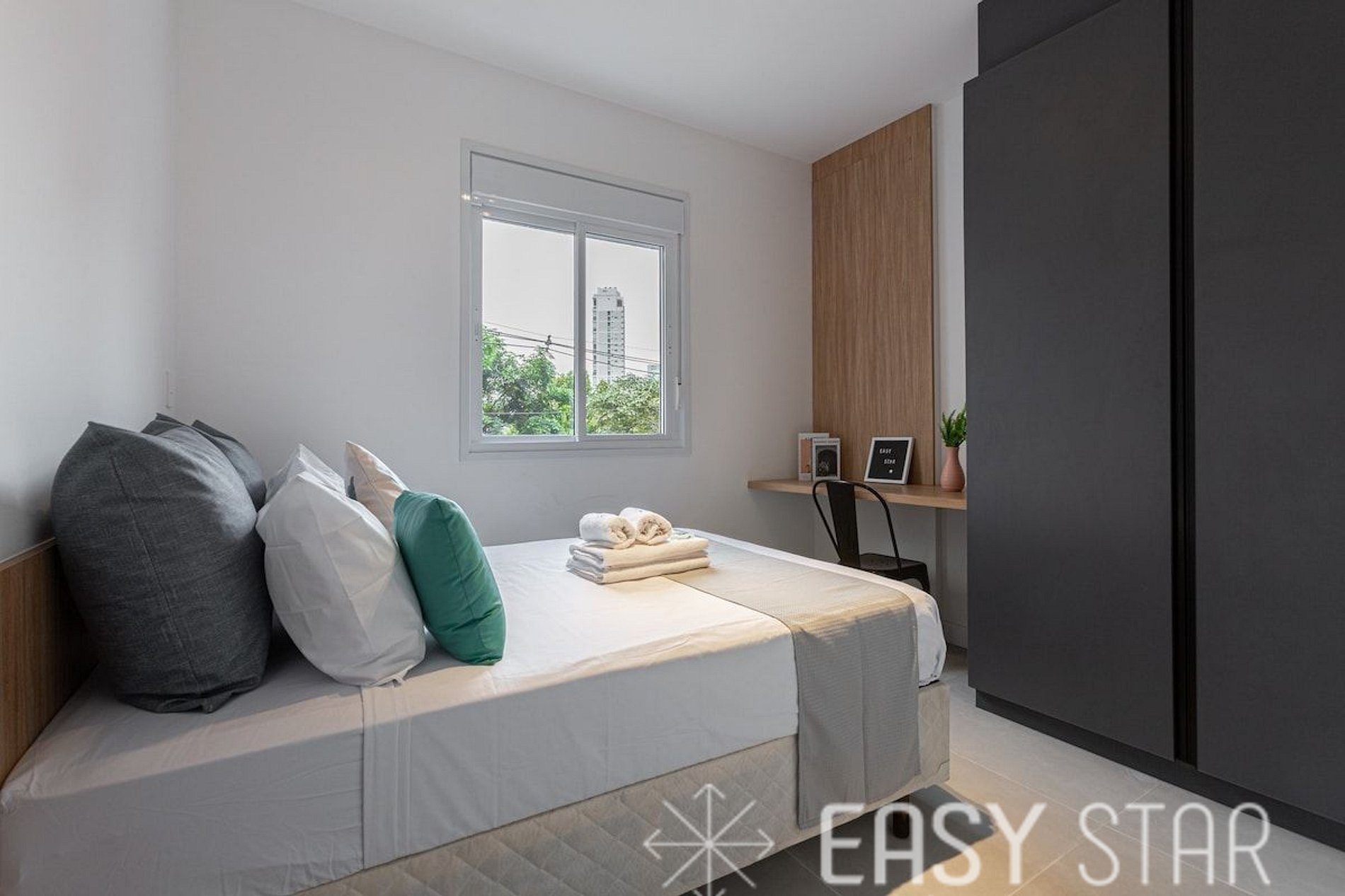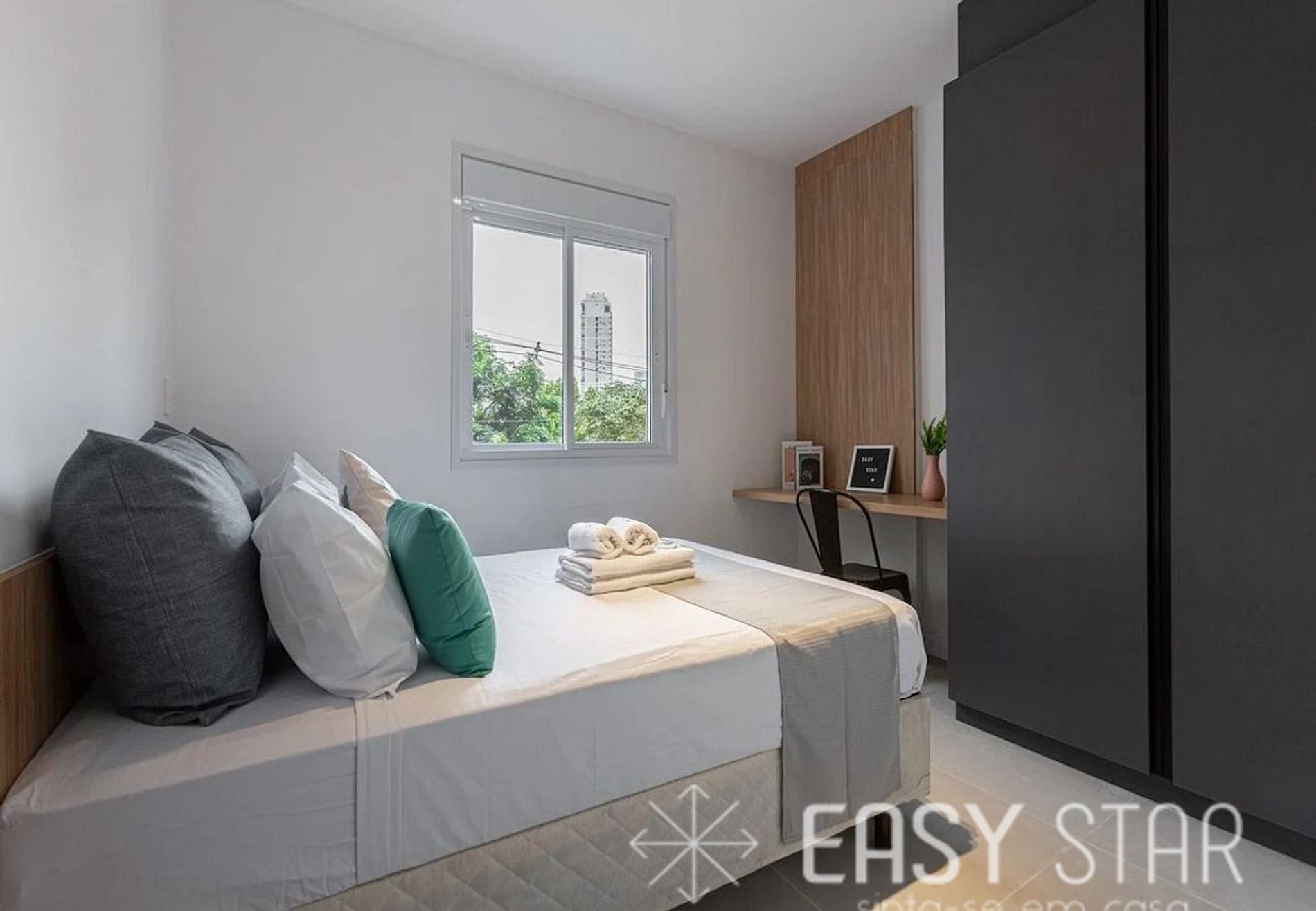 Além disso, o apartamento oferece um espaço para home office, equipado para acomodar uma pessoa, proporcionando um ambiente tranquilo para o trabalho ou estudo.