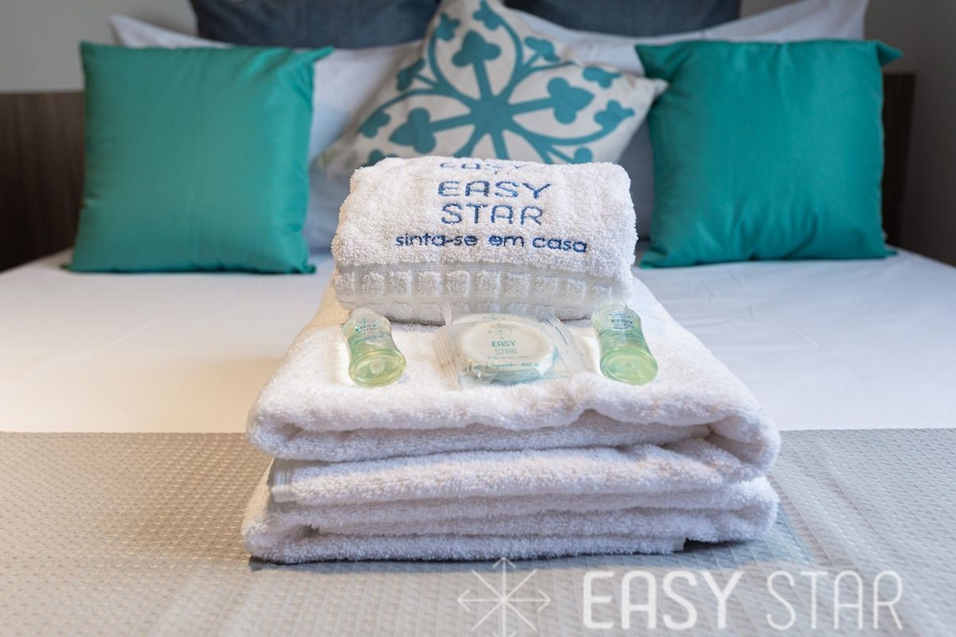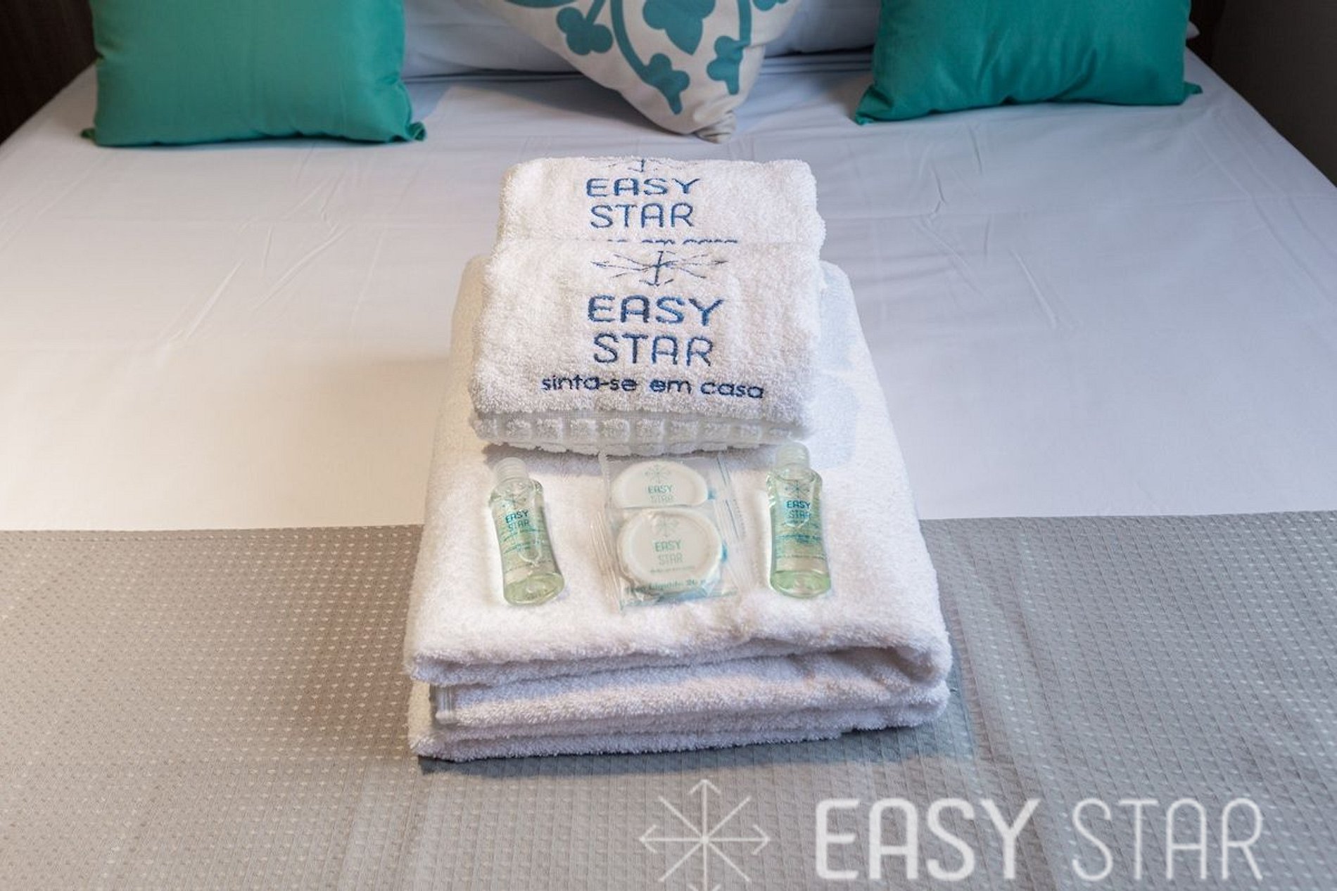 1 kit banho por hóspede com 1 toalha de corpo, 1 uma de rosto