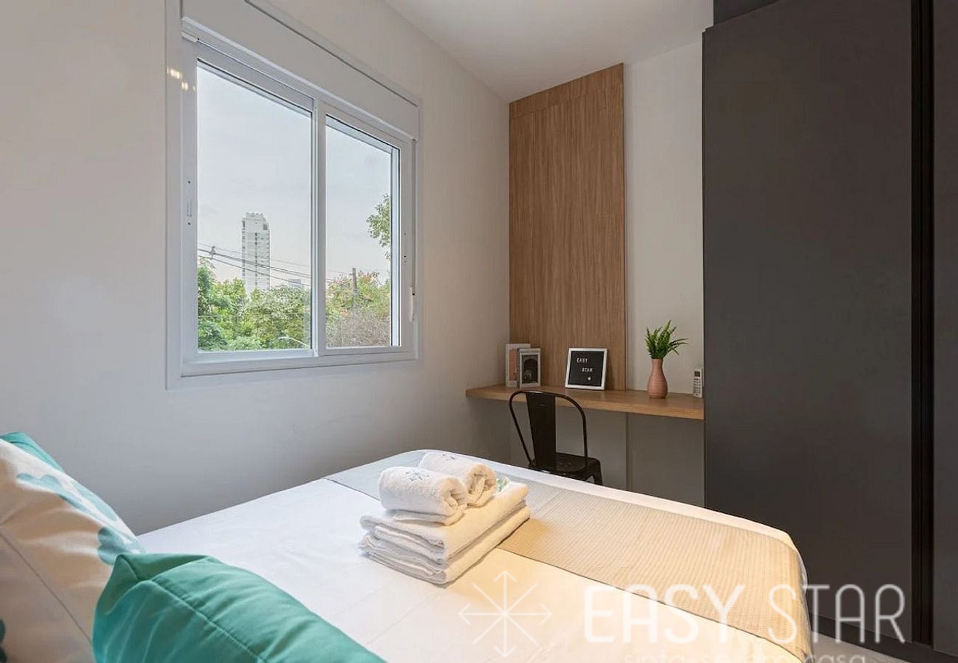 Este apartamento de 33m² é projetado para oferecer uma experiência acolhedora e prática. No quarto, você encontrará uma cama de casal padrão que garante uma ótima noite de sono. Além disso, o quarto é equipado com ar condicionado, permitindo que você ajuste a temperatura ao seu gosto. Há também um armário espaçoso para armazenar suas roupas e pertences com facilidade.