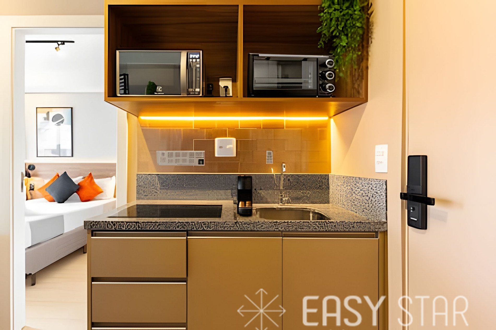 Seja bem-vindo ao nosso encantador apartamento! Aqui, acomodamos confortavelmente até duas pessoas em uma cama tamanho casal padrão. Nossa atenção aos detalhes é o que nos torna especiais. Preparamos tudo o que você precisa para tornar a sua estadia uma experiência única. A cozinha está totalmente equipada com um cooktop de indução com 2 bocas, liquidificador, panelas, copos, pratos e talheres, permitindo que você cozinhe suas refeições com facilidade. Para os amantes de café, oferecemos uma máquina Nespresso para que você possa desfrutar de suas bebidas favoritas a qualquer momento. Para sua conveniência, disponibilizamos um secador de cabelo e um ferro de passar, garantindo que você esteja sempre impecável durante sua estadia. Por favor, note que a voltagem da unidade é de 110W, então você não precisa se preocupar com adaptadores. Disponibilizamos enxoval completo de cama e banho (troca do enxoval com custo extra) 1 kit banho por hóspede com 1 toalha de corpo, 1 uma de rosto Roupa de cama com lençol de elástico, lençol sem elástico 1 travesseiro com fronha por hóspede. E 1 manta microfibra por cama. Além disso, o nosso estúdio possui uma adorável varanda que permite a entrada de uma linda iluminação natural, criando um ambiente acolhedor e aconchegante para sua estadia. Esperamos que você aproveite sua estadia conosco e se sinta em casa em nosso estúdio bem-equipado. Seja bem-vindo e desfrute de todos os confortos que preparamos para tornar sua experiência memorável.