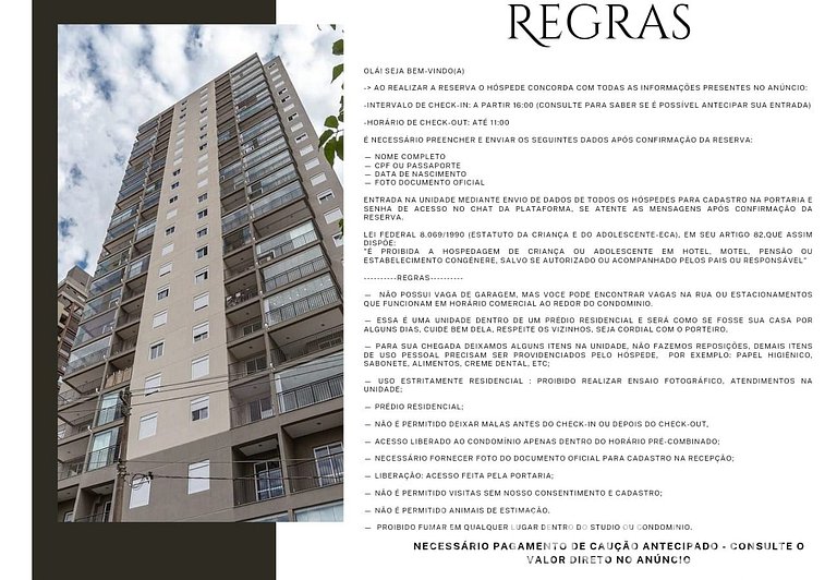 • Uso: Este é um apartamento dentro de um prédio residencial. Cuide bem do espaço, respeite os vizinhos e seja cordial com o porteiro.