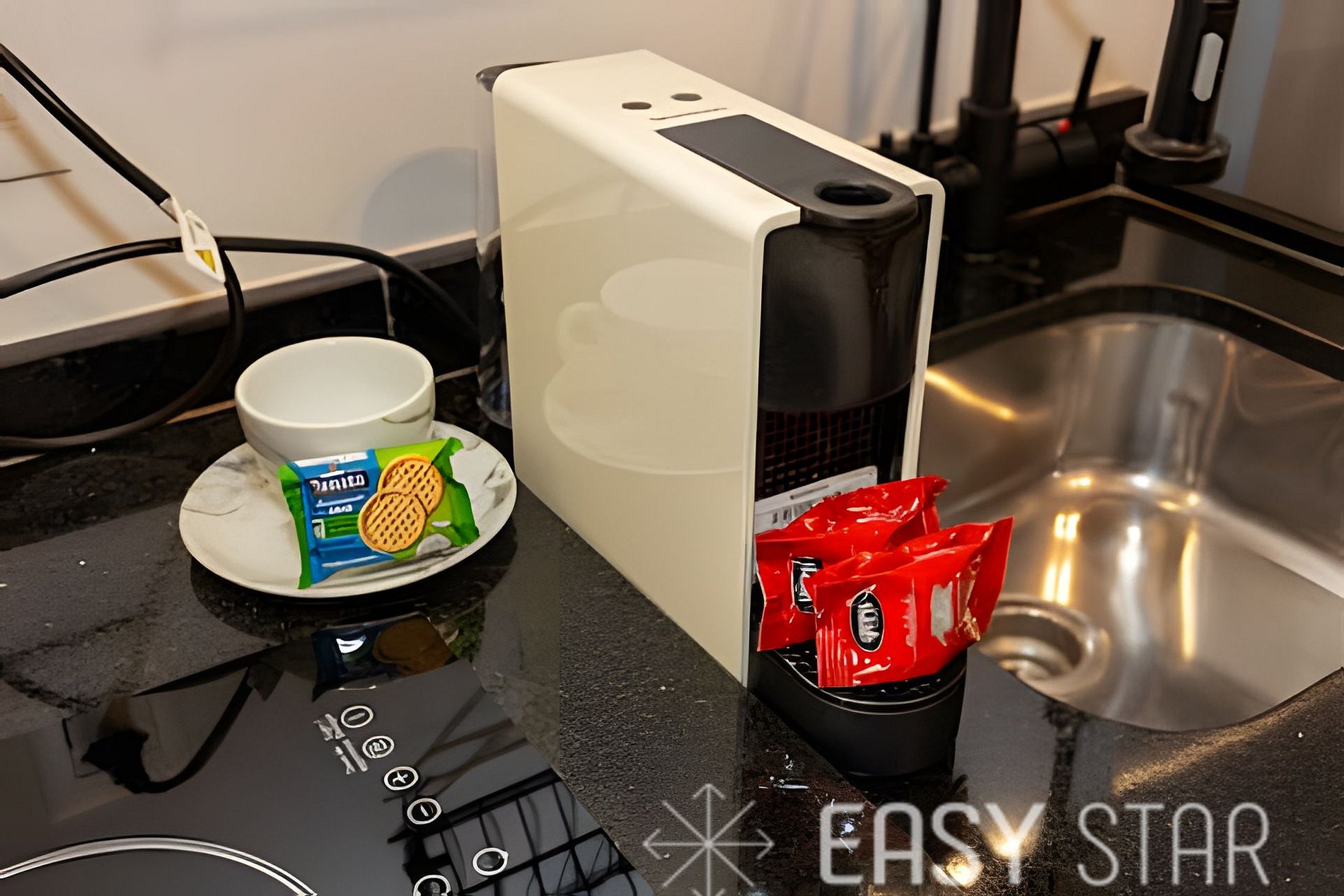 O andar inferior abriga uma sala completa com um sofá-cama confortável para acomodar até 2 hóspedes adicionais. A cozinha, totalmente equipada com um cooktop de indução 2 bocas, um forninho elétrico, uma máquina de café Nespresso e um liquidificador, você terá tudo o que precisa para preparar refeições deliciosas. Os utensílios de cozinha, incluindo facas afiadas, talheres, pratos, copos e xícaras, foram selecionados para garantir que sua experiência culinária seja impecável.
