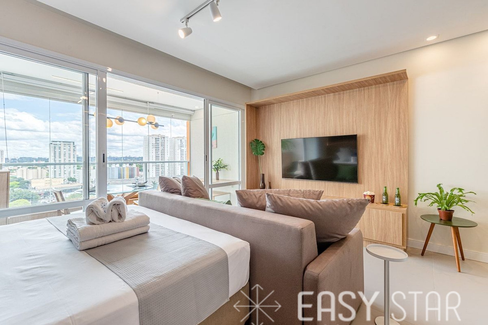 A diversão está garantida com a nossa TV smart, que gira impressionantes 270° graus, permitindo que você assista aos seus programas e filmes favoritos tanto do sofá quanto da cama. Você nunca perde um momento importante, não importa onde esteja no apartamento.