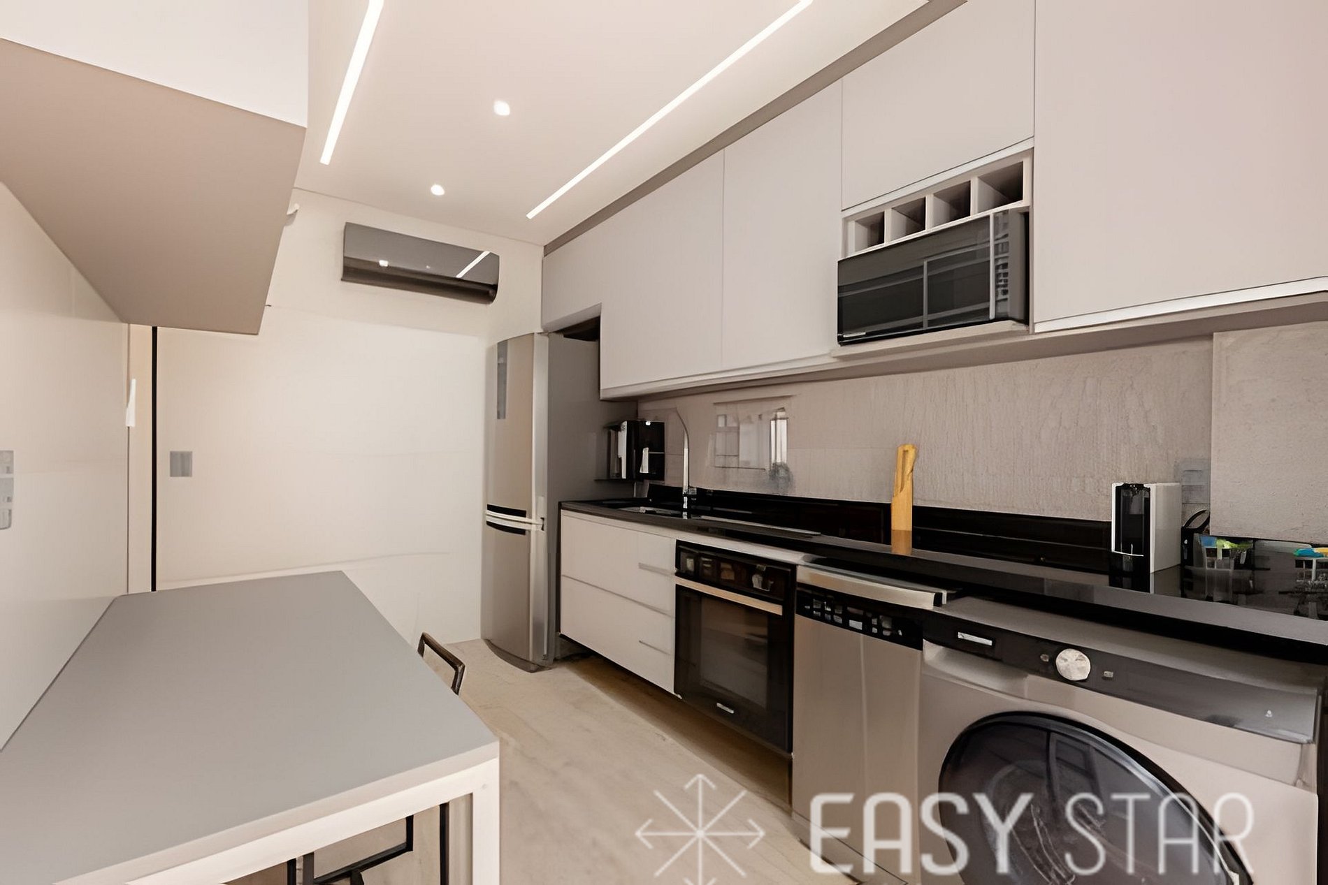 Ele dispõe de uma cozinha completa, equipada com um fogão indução, micro-ondas, geladeira de duas portas, máquina de café Nespresso, panelas, talheres, copos e pratos. Conta também com uma lava louças e uma lava e seca. A sala é um espaço acolhedor com uma TV e canais a cabo.