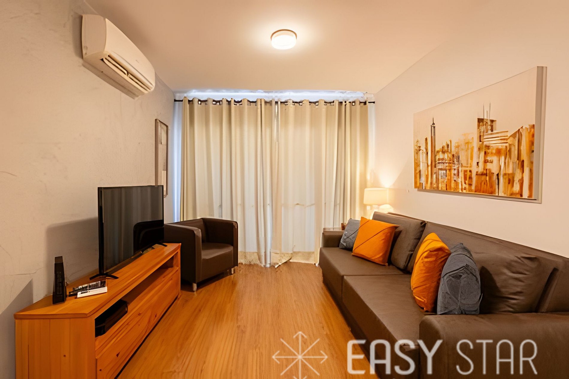 Conta com ar condicionado em todos os quartos e sala.