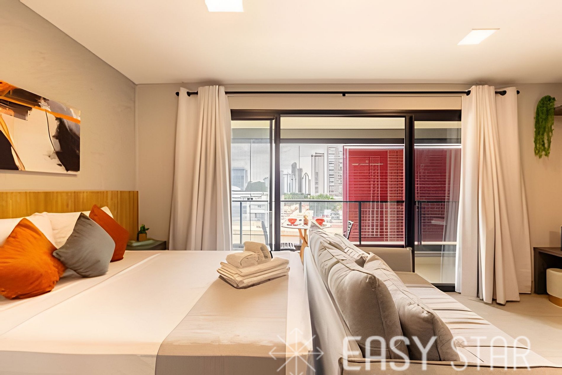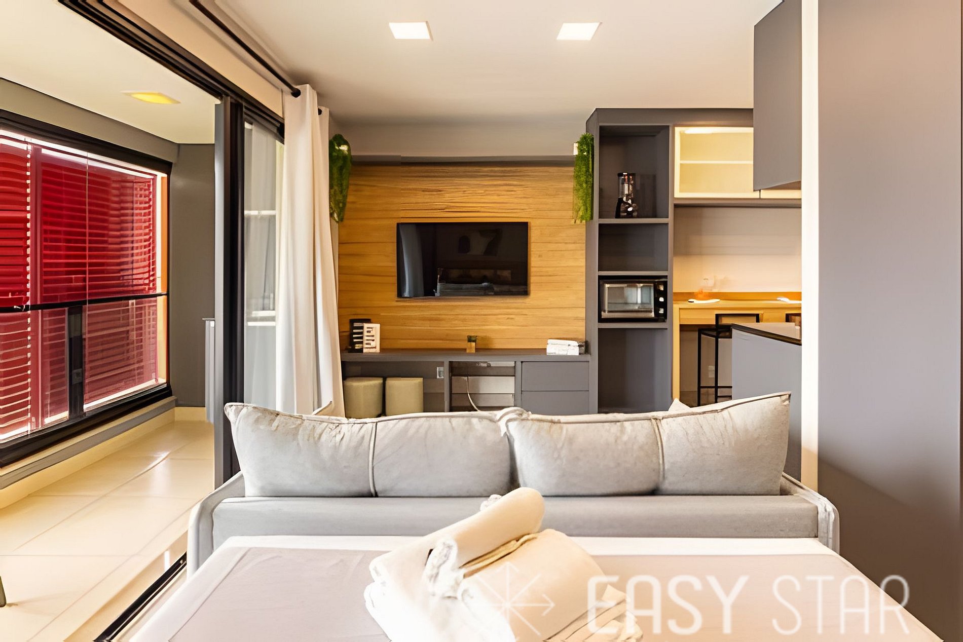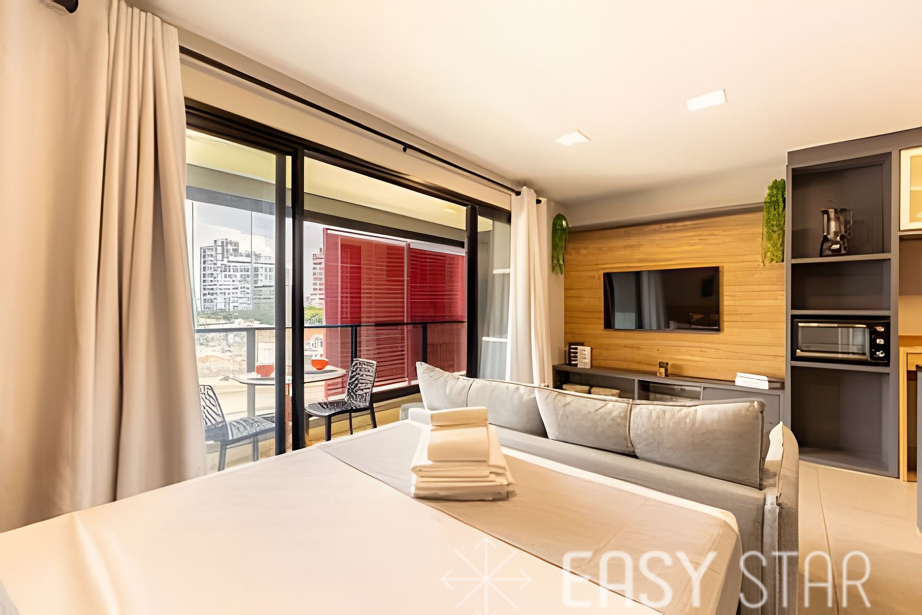 Aqui, você encontrará uma cama de casal com um colchão novo de tamanho padrão, ideal para acomodar até duas pessoas. O quarto também dispõe de um amplo guarda-roupa e uma TV que gira, permitindo que você assista confortavelmente tanto da cama quanto do sofá. A sala de estar é um espaço acolhedor, com um sofá-cama confortável que acomoda até dois hóspedes. Banheiro com chuveiro a gás com box em vidro e lavatório individualizado. Para sua conveniência, o studio está equipado com utensílios básicos e necessários para uma estadia agradável. A cozinha compacta conta com um cooktop de duas bocas, panelas Tramontina, liquidificador, batedeira, espremedor de laranja, micro-ondas e geladeira. Você encontrará também um filtro de água, talheres, pratos e copos, tornando mais fácil preparar suas refeições favoritas. Tem uma máquina de café Nespresso, para incrementar sua estadia. Para sua conveniência, disponibilizamos um secador de cabelo e um ferro de passar, garantindo que você esteja sempre impecável durante sua estadia. Por favor, note que a voltagem da unidade é de 110W, então você não precisa se preocupar com adaptadores. Disponibilizamos enxoval completo de cama e banho (troca do enxoval com custo extra) 1 kit banho por hóspede com 1 toalha de corpo, 1 uma de rosto Roupa de cama com lençol de elástico, lençol sem elástico 1 travesseiro com fronha por hóspede. 1 manta microfibra por cama. Além disso, o studio possui uma encantadora varanda com vista para o bairro, que oferece uma abundância de luz natural, criando um ambiente alegre e acolhedor. Estamos ansiosos para recebê-lo e proporcionar uma estadia agradável e memorável. Seja nosso hóspede e desfrute de todas as comodidades que nosso studio tem a oferecer. Sua satisfação é nossa prioridade.