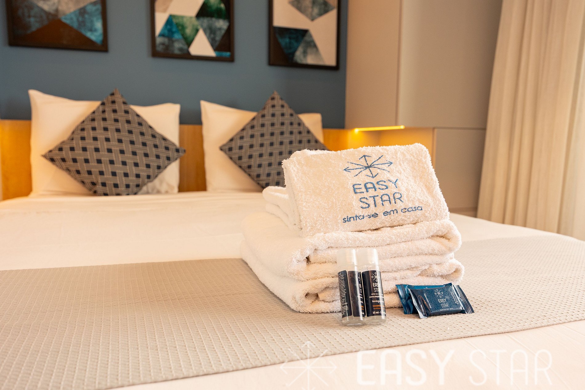 • Kit de banho por hóspede: 1 toalha de corpo e 1 de rosto.