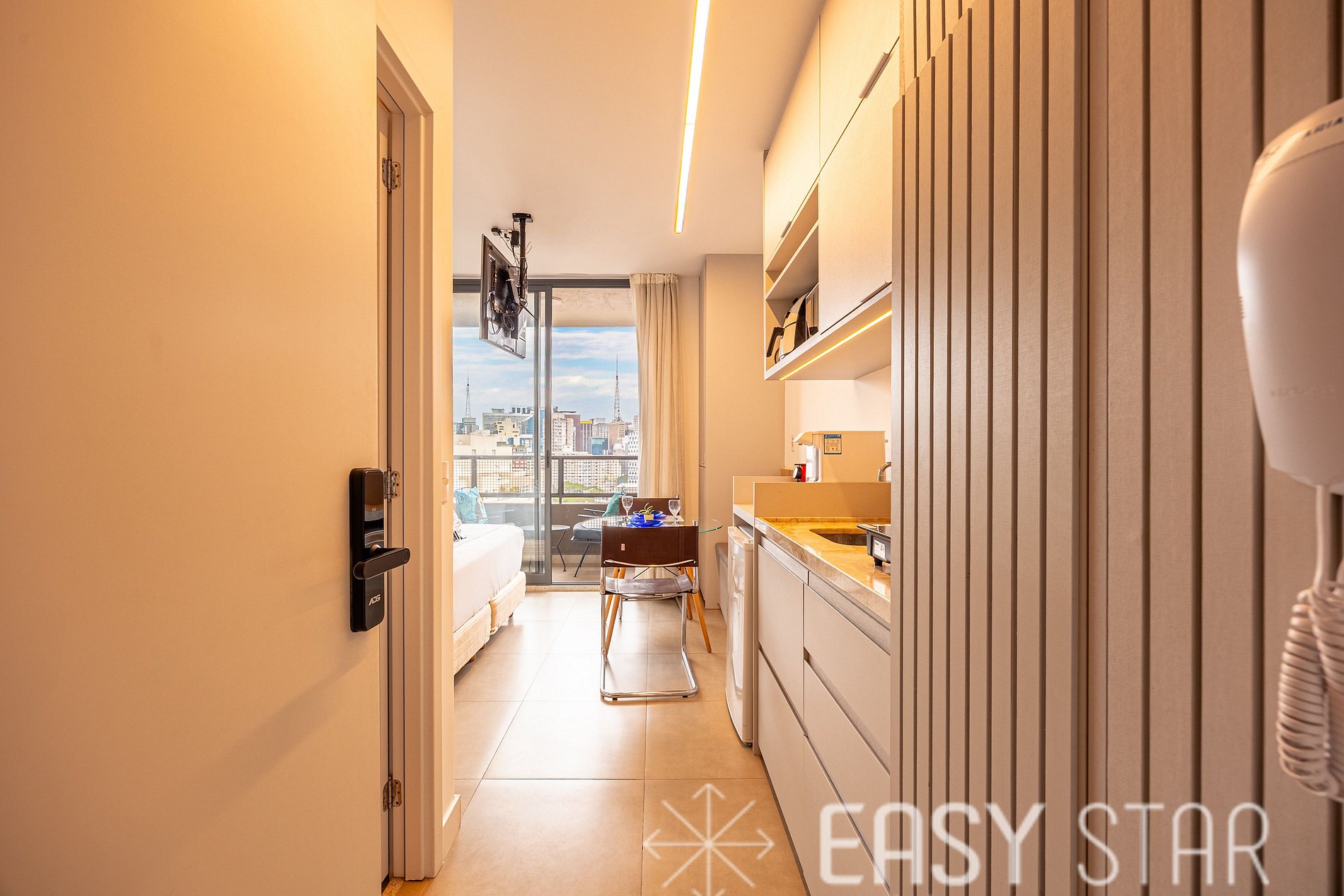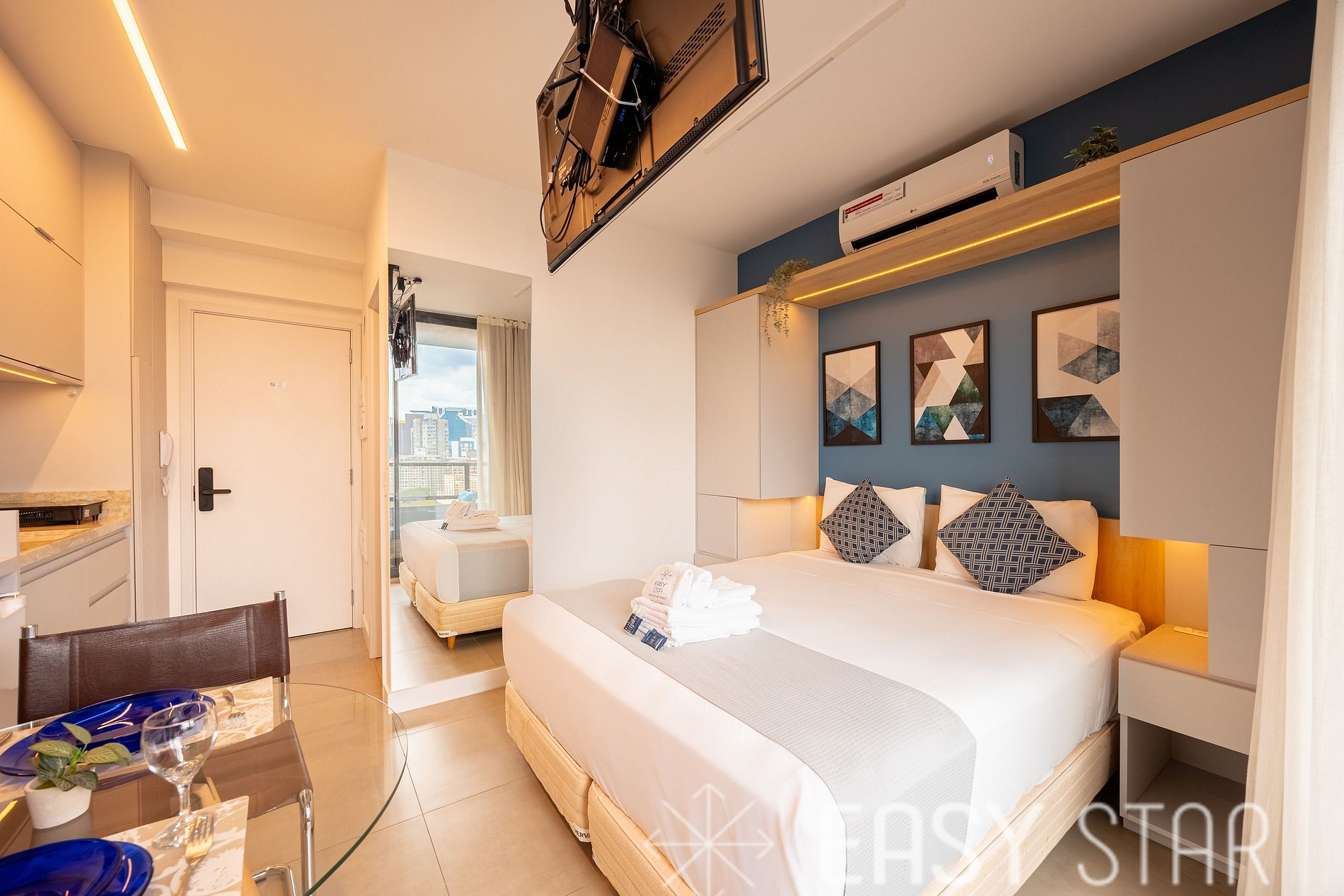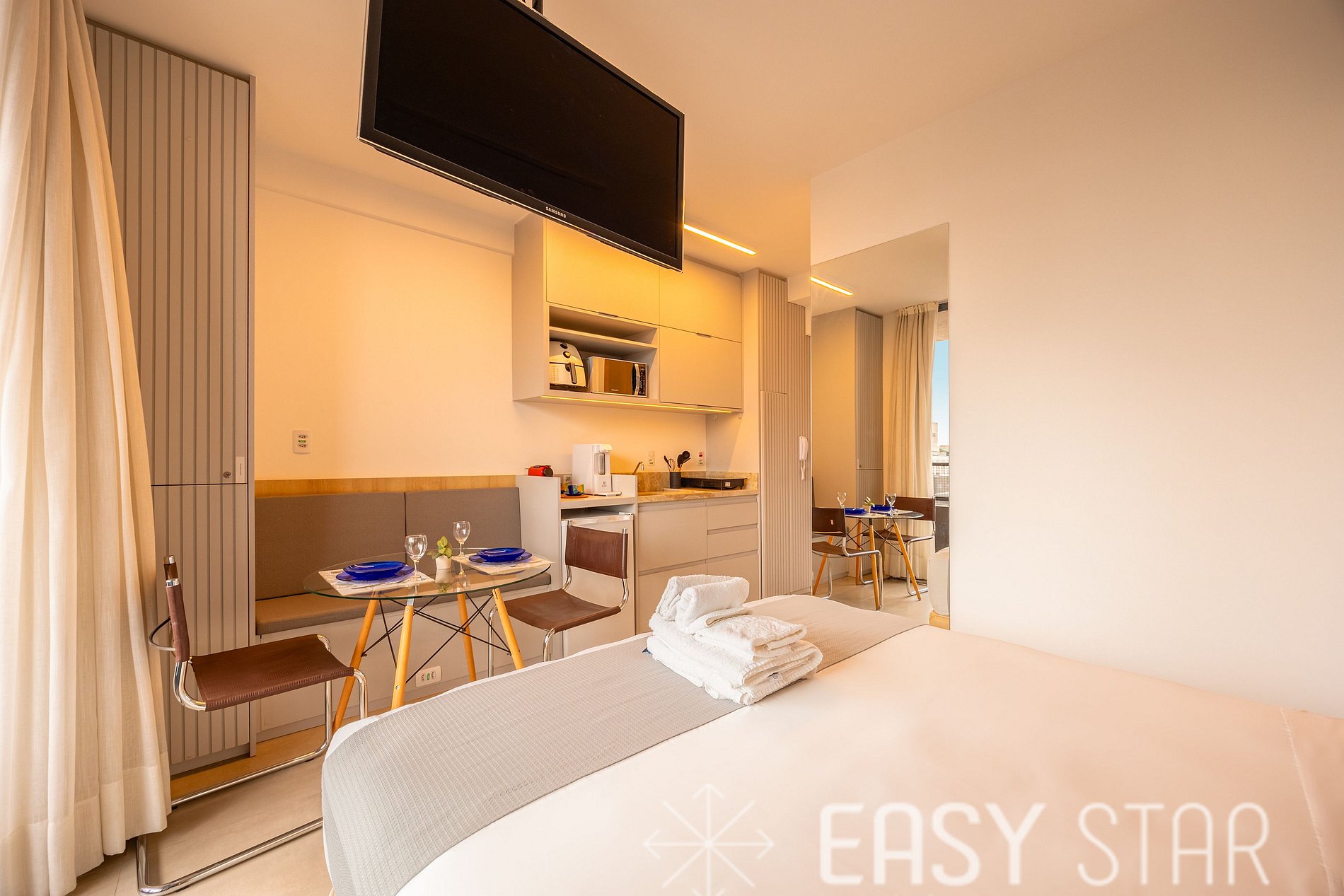 Acomoda até 2 pessoas. Studio conta com cama queen, ar-condicionado split, tv e WI-Fi. Conta com enxoval completo de cama e banho, sendo uma toalha de rosto e uma de corpo para cada hóspede. Cozinha equipada com cooktop, forno, máquina Nespresso, micro-ondas, frigobar e demais utensílios para cozinhar. Tem secador de cabelo e ferro de passar roupa.