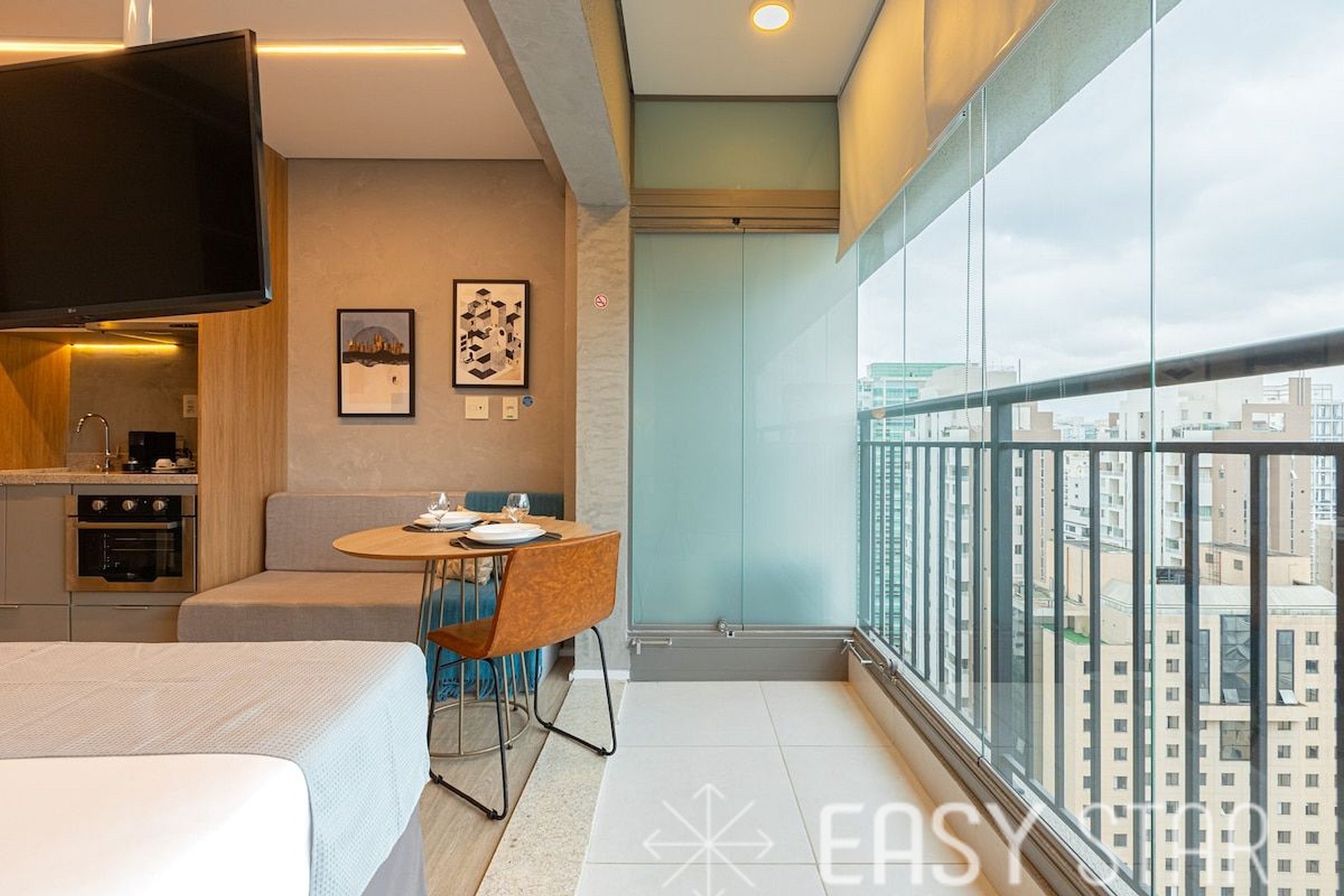 Magnifico studio que acomoda até 3 hóspedes. Dispõe de uma cama Queen-size e um sofá cama. Com 25m2 planejado por arquiteto, possui ar-condicionado, armário para roupas, Smart Tv com canais abertos, WI-FI e ferro de passar roupa tradicional. A cozinha é completa e tem máquina Nespresso, fogão e forno eletrico, geladeira, micro-ondas, liquidificador, panelas, talheres, pratos e copos... Ideal para o preparo das suas refeições. Inclui roupa de cama e banho para que a sua estadia seja mais confortável. Disponibilizamos 1 manta microfibra por cama. Linda vista do bairro, localizado a poucos passos do metrô Moema.