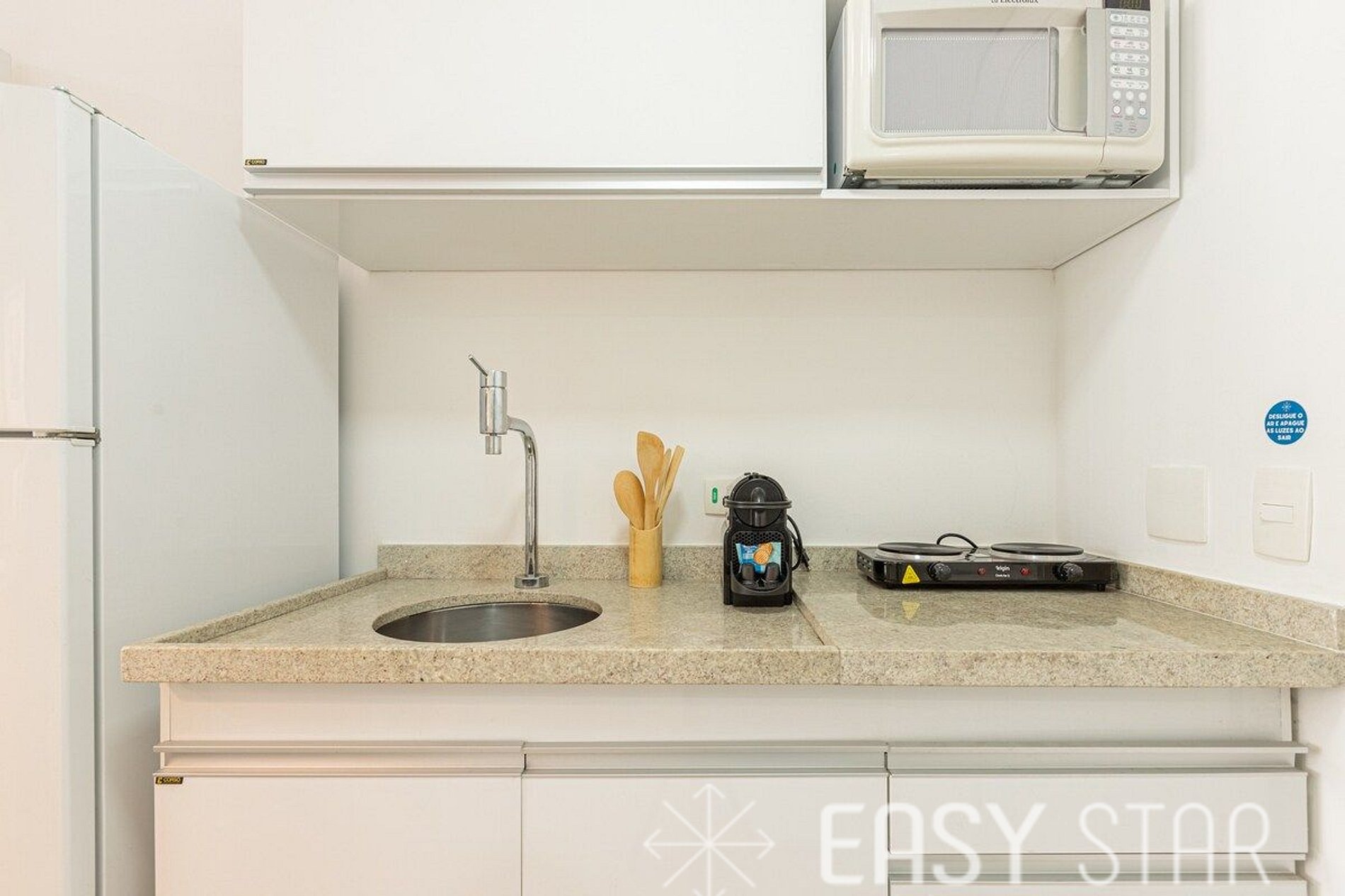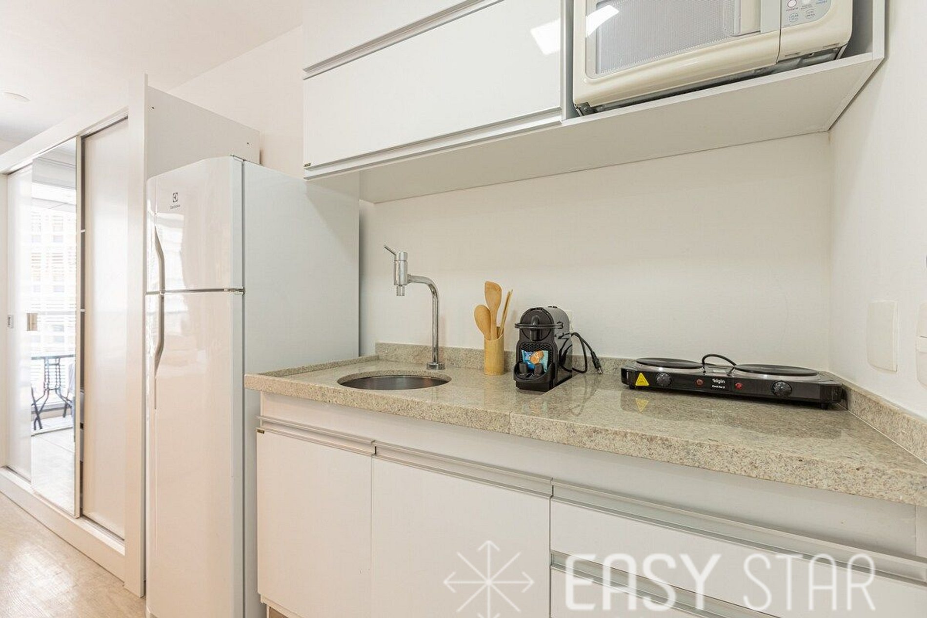Cozinha completa e compacta conta com micro-ondas, geladeira duas portas, cooktop indução de 2 bocas, máquina Nespresso e demais utensilios para o preparo das suas refeições.