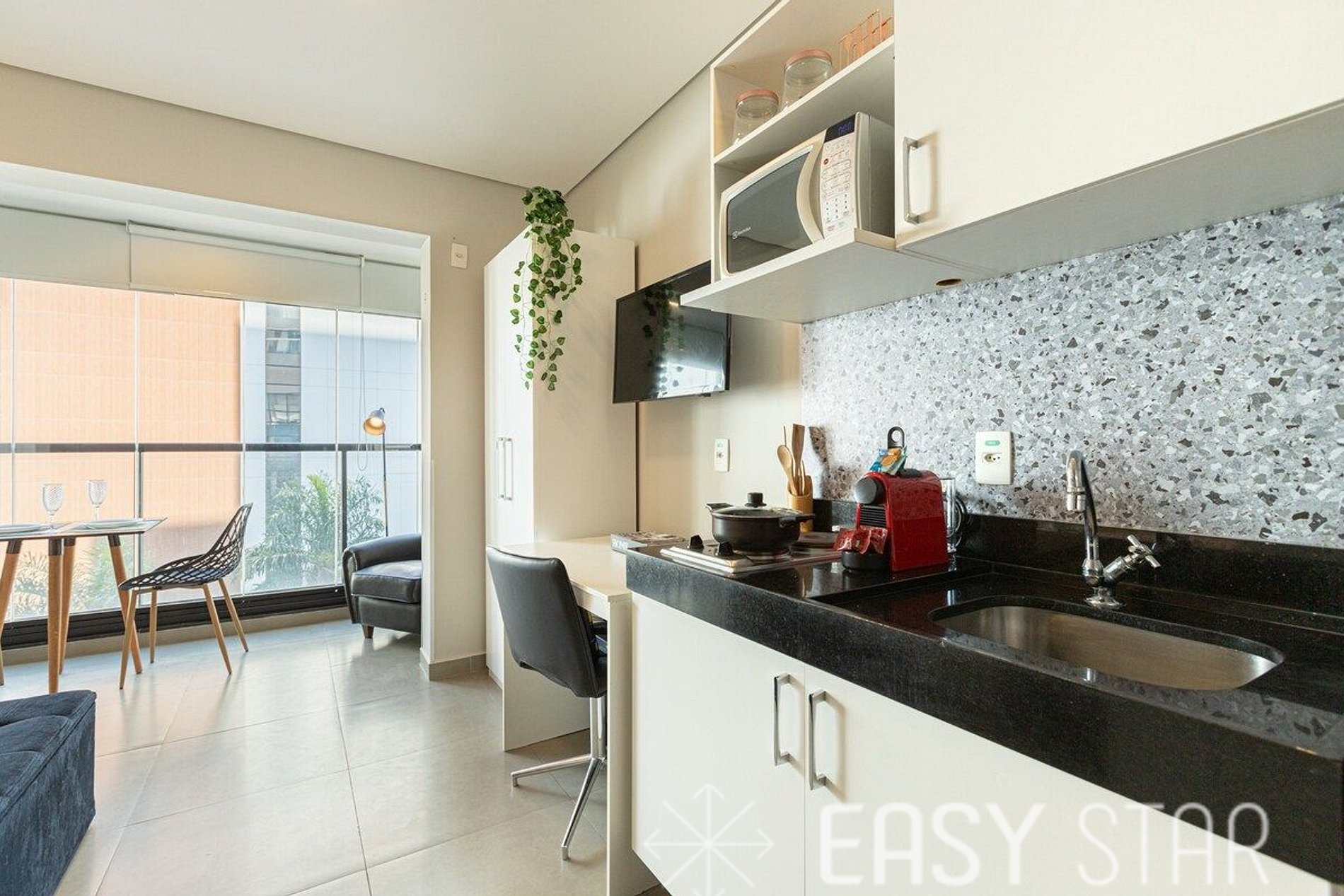 Belo studio, acomoda 2 pessoas e uma cama casal padrão. Possui ar condicionado, armário, varanda com vista e envidraçada, TV a cabo e WI-FI. Cozinha devidamente equipada, possui cafeteira Nespresso, fogão cooktop com 1 boca, panelas, frigobar, micro-ondas e demais utensílios necessários. Roupas de cama e banho também inclusas na hospedagem para você não se preocupar com nada! É bem iluminado e conta com espaço para home office e mesa de jantar com uma bela vista! Aproveite para registar momentos no cantinho de leitura composto por uma poltrona vintage e abajur para climatizar esse momento.