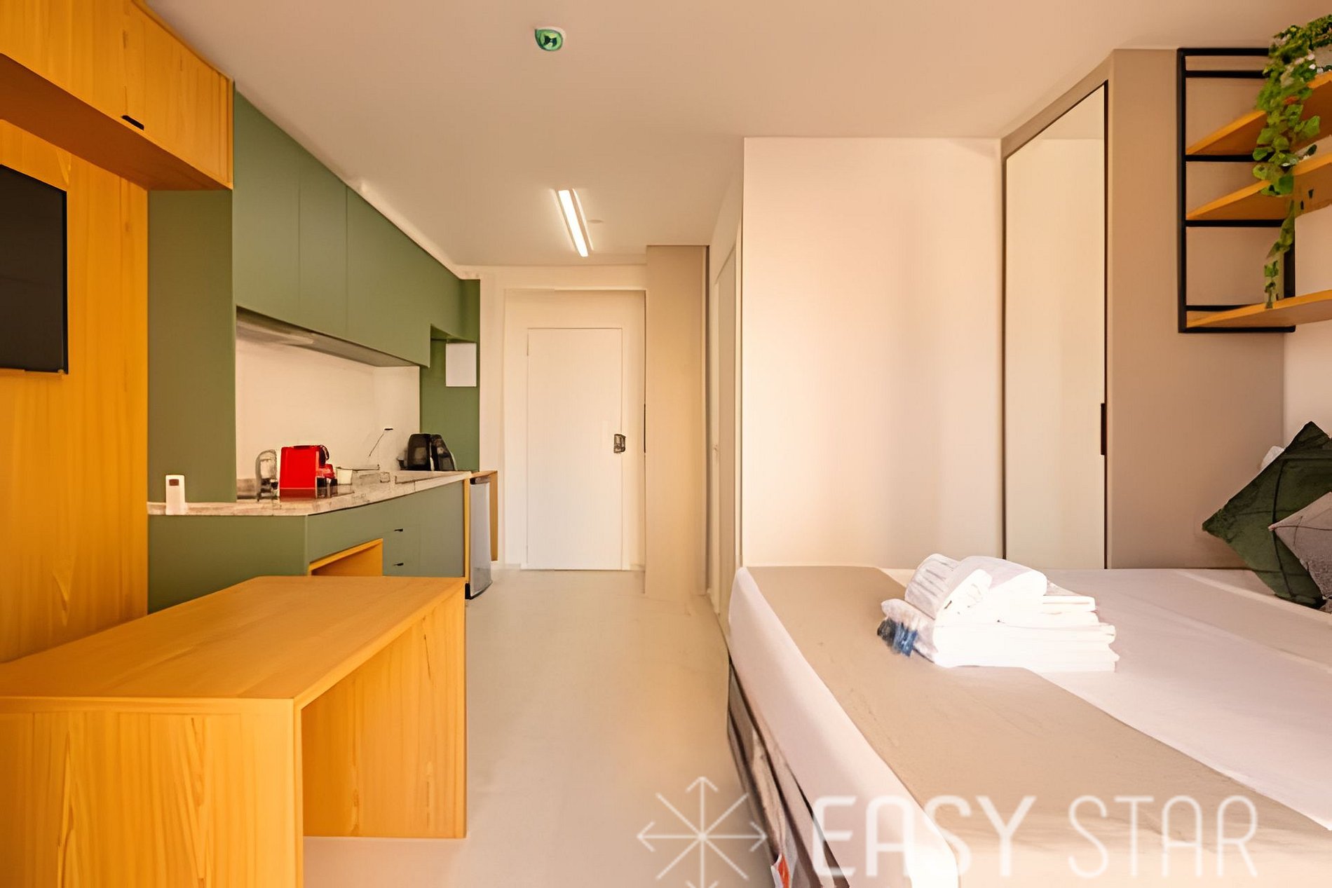 Venha desfrutar de uma estadia acolhedora em nosso espaço, ideal para casais, amigos ou famílias pequenas. Com uma cama de casal padrão que acomoda até duas pessoas Para o seu entretenimento, oferecemos uma Smart TV com TV a cabo e Wi-Fi de alta velocidade, para que você possa se manter conectado e aproveitar suas séries favoritas. Nossa cozinha totalmente equipada inclui uma cafeteira Nespresso para começar o dia com um café delicioso, um cooktop, geladeira, micro-ondas e todos os utensílios necessários para preparar suas refeições com facilidade.