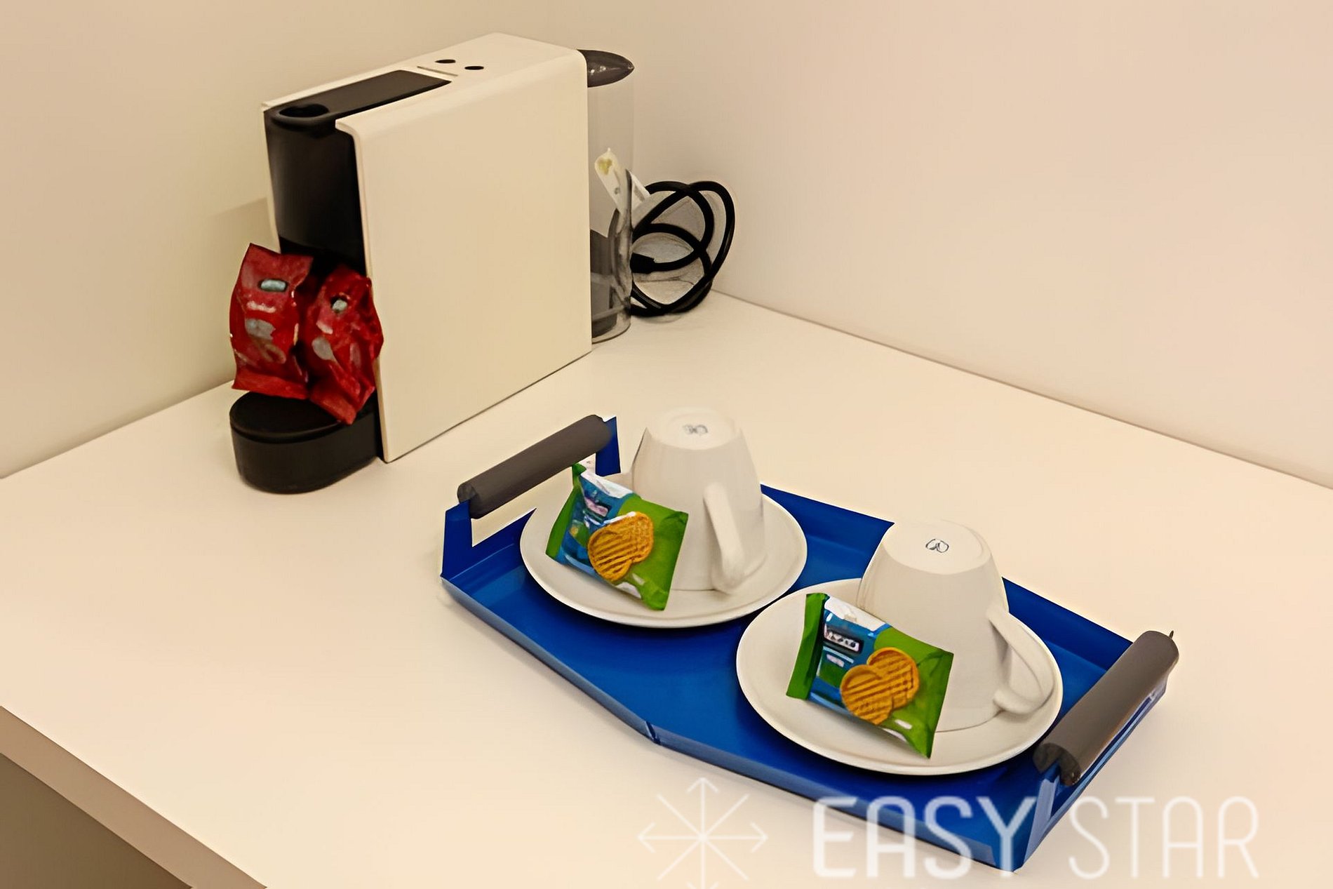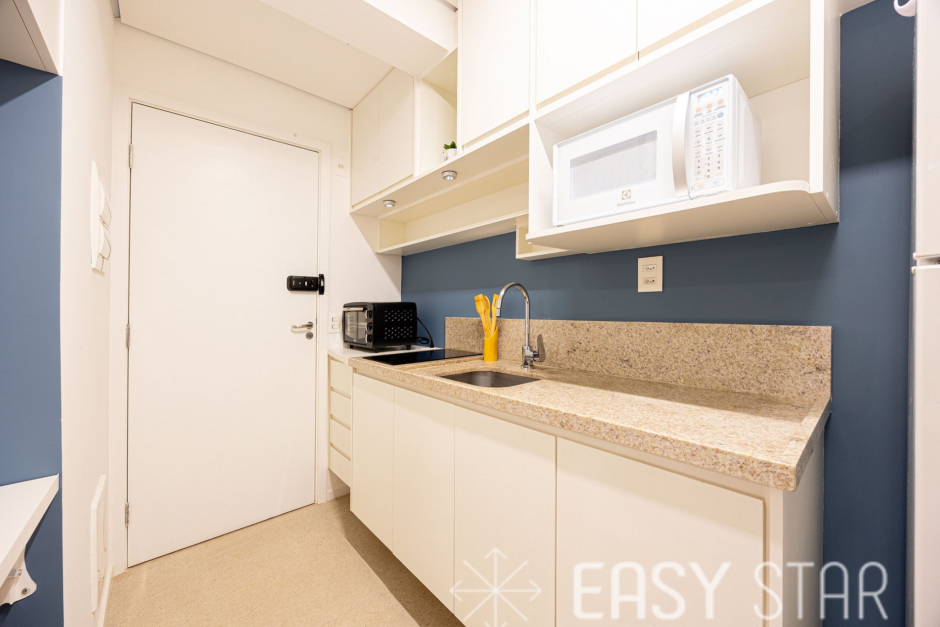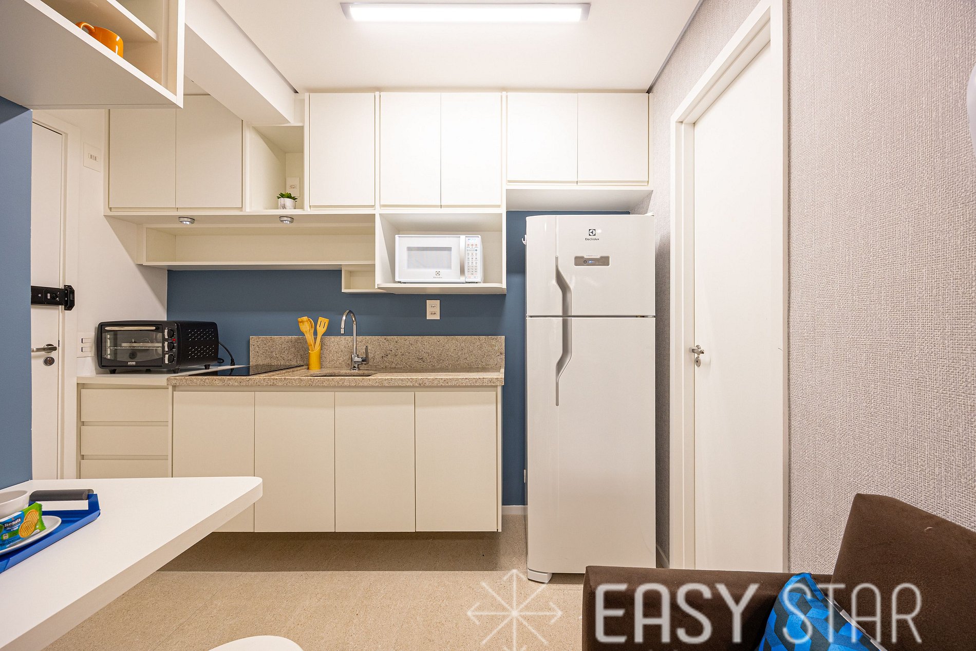 Pensamos em cada detalhe para que sua experiência seja única. A cozinha está totalmente equipada com cooktop elétrico, geladeira, micro-ondas com função forno, liquidificador, panelas, utensílios e uma máquina Nespresso.